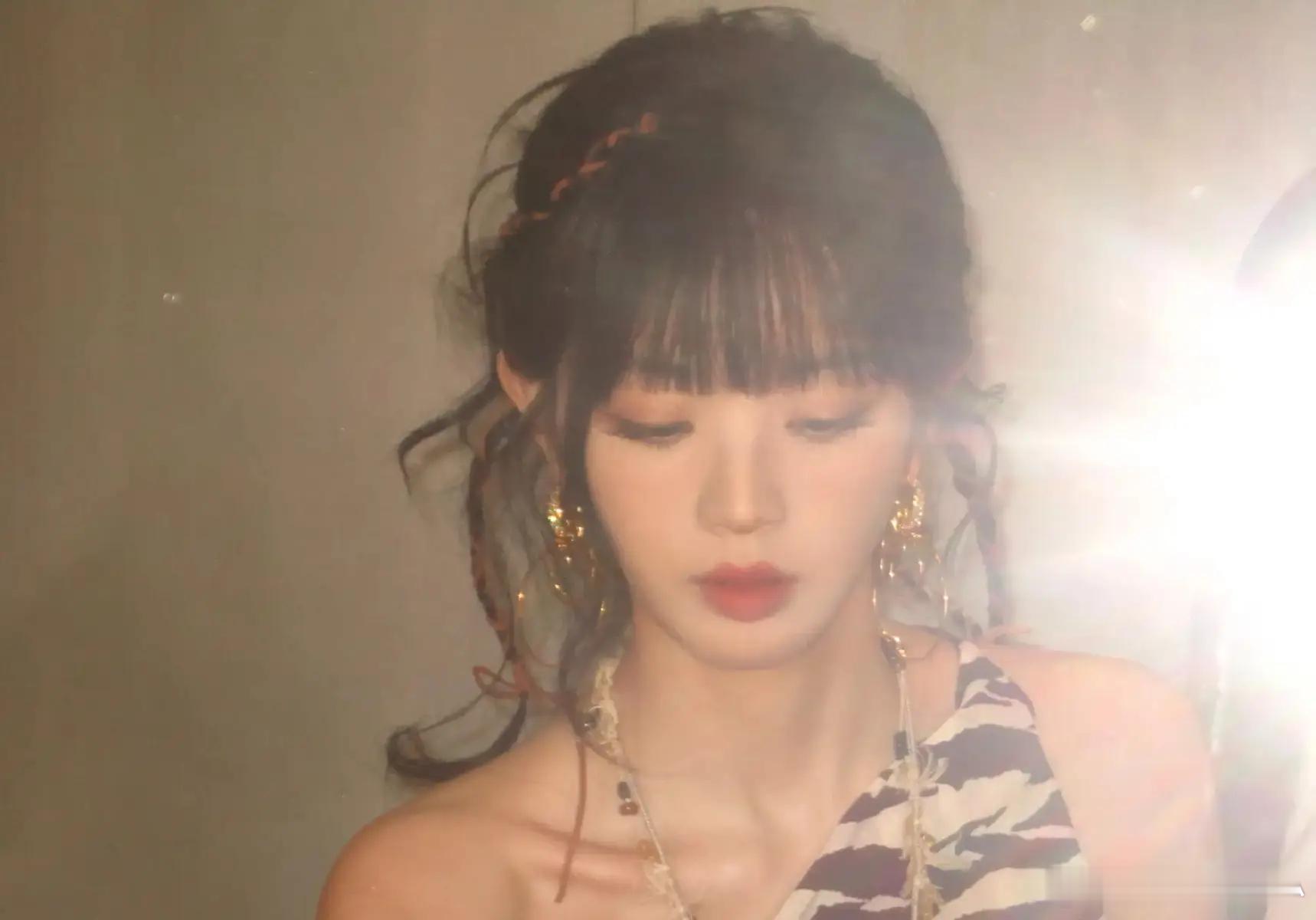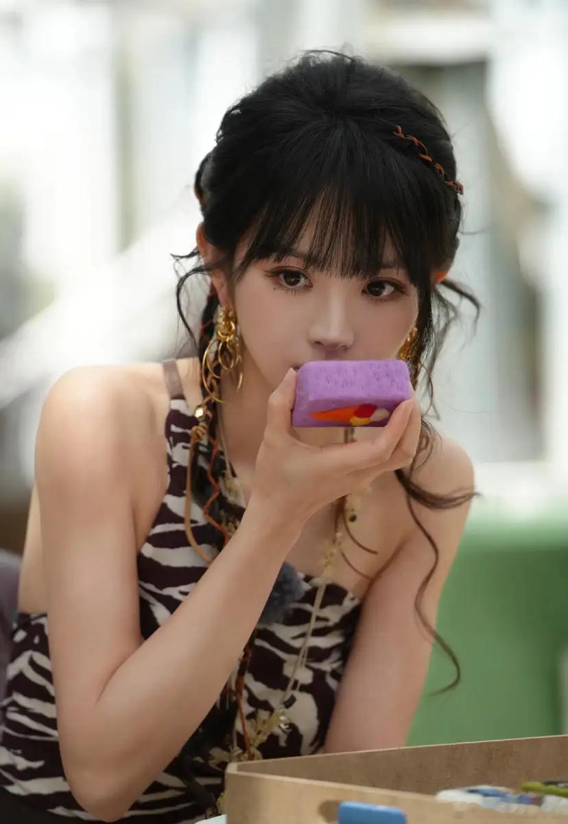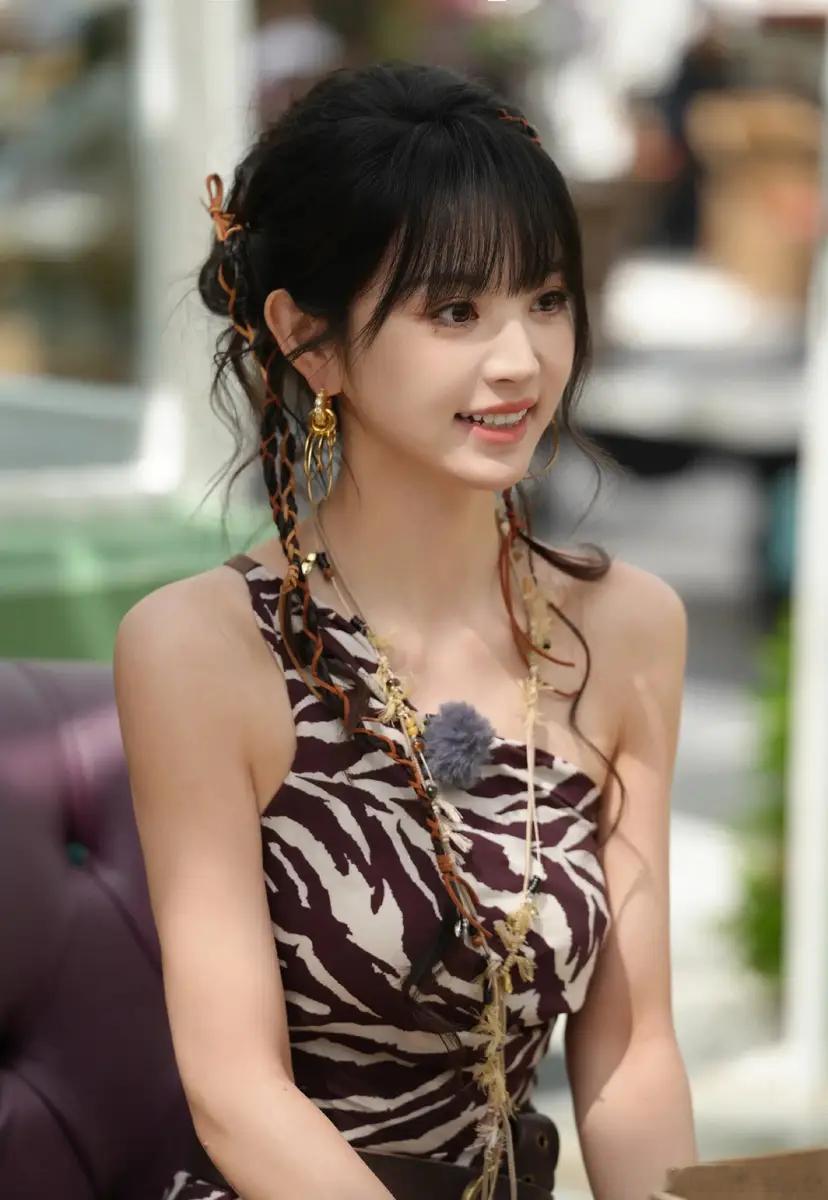 田曦薇穿棕白色条纹裙美艳性感 微微侧脸甜美元气