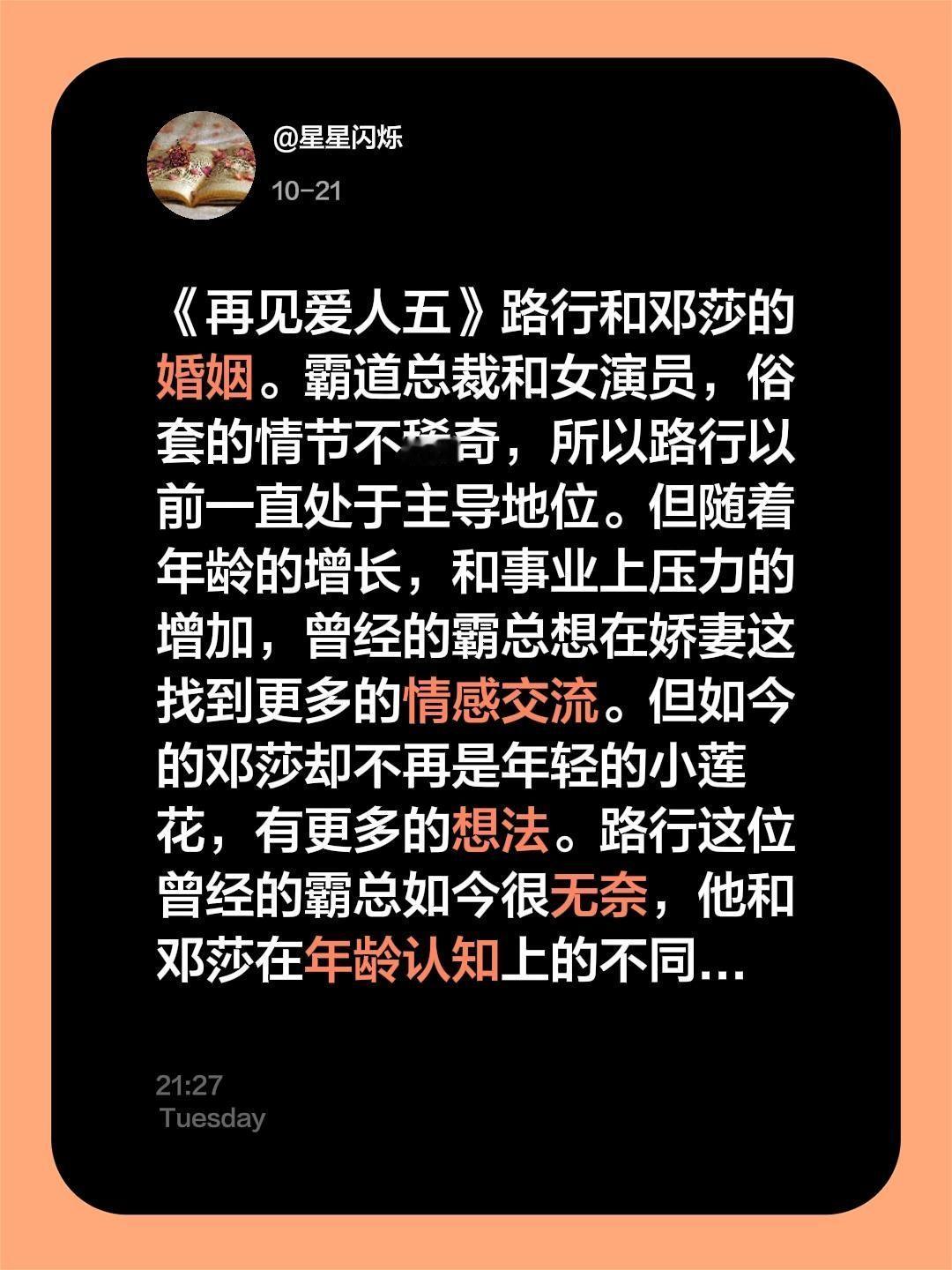我评论了@橘子娱乐. 的作品: 《再见爱人五》路行和邓莎的婚姻。霸道总裁和女演员,俗套的情节不稀奇,所以路行以前一直处于主导地位。但随着年龄的增长,和事业上压力的增加,曾经的霸总想在娇妻这找到更多的情感交流。但如今的邓莎却不再是年轻的小莲花,有更多的想法。路行这位曾经的霸总如今很无奈,他和邓莎在年龄认知上的不同也在对儿子的教育理念上分歧,他想管但力不从心。再见爱人5 再见爱人 路行邓莎