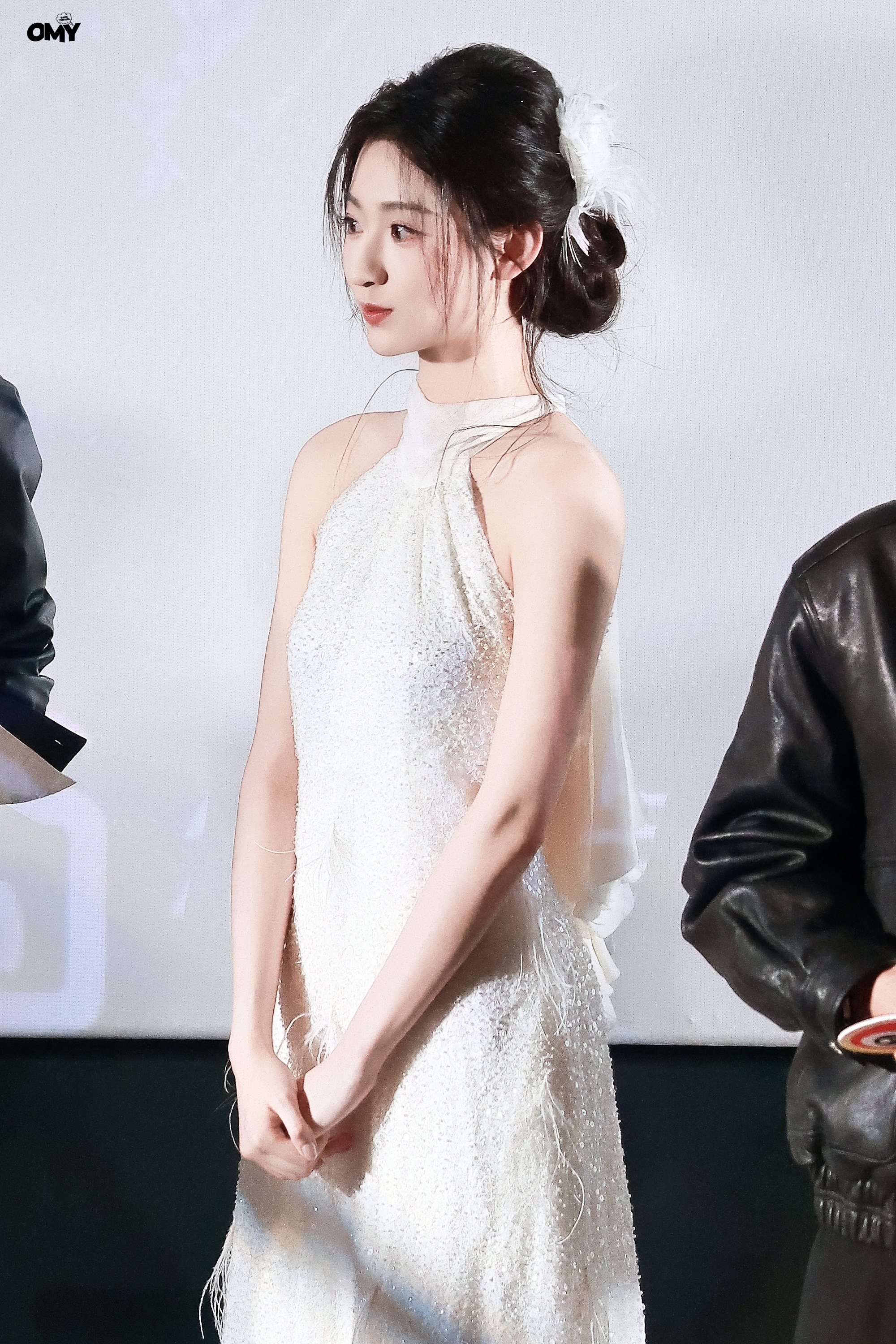 杨雨潼 发间白羽似月光凝落,将青丝绾成温柔的结,一身碎光白裙衬得眉眼更清,恰似从旧梦深处走来的诗。杨雨潼白鹤盘发造型