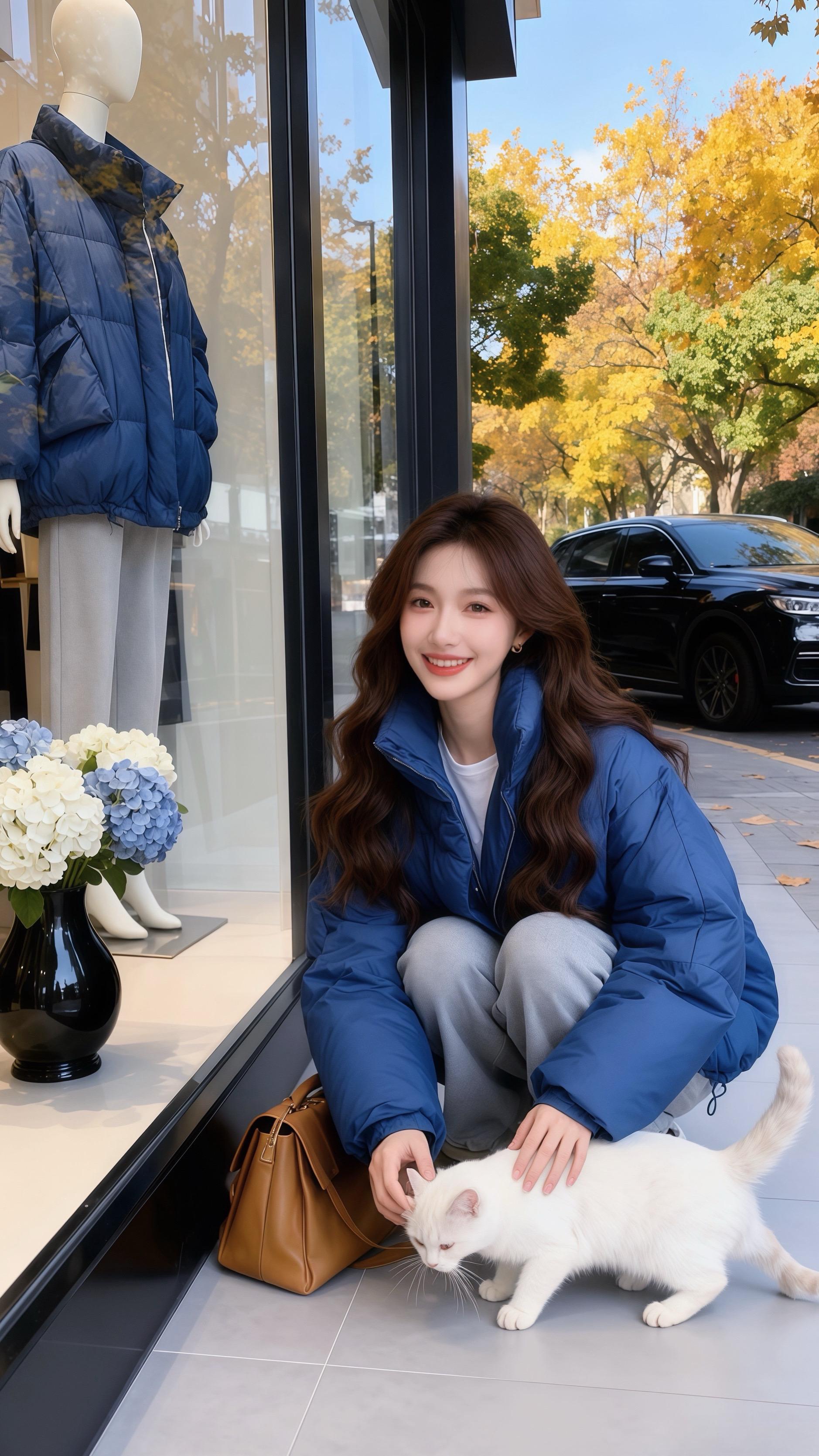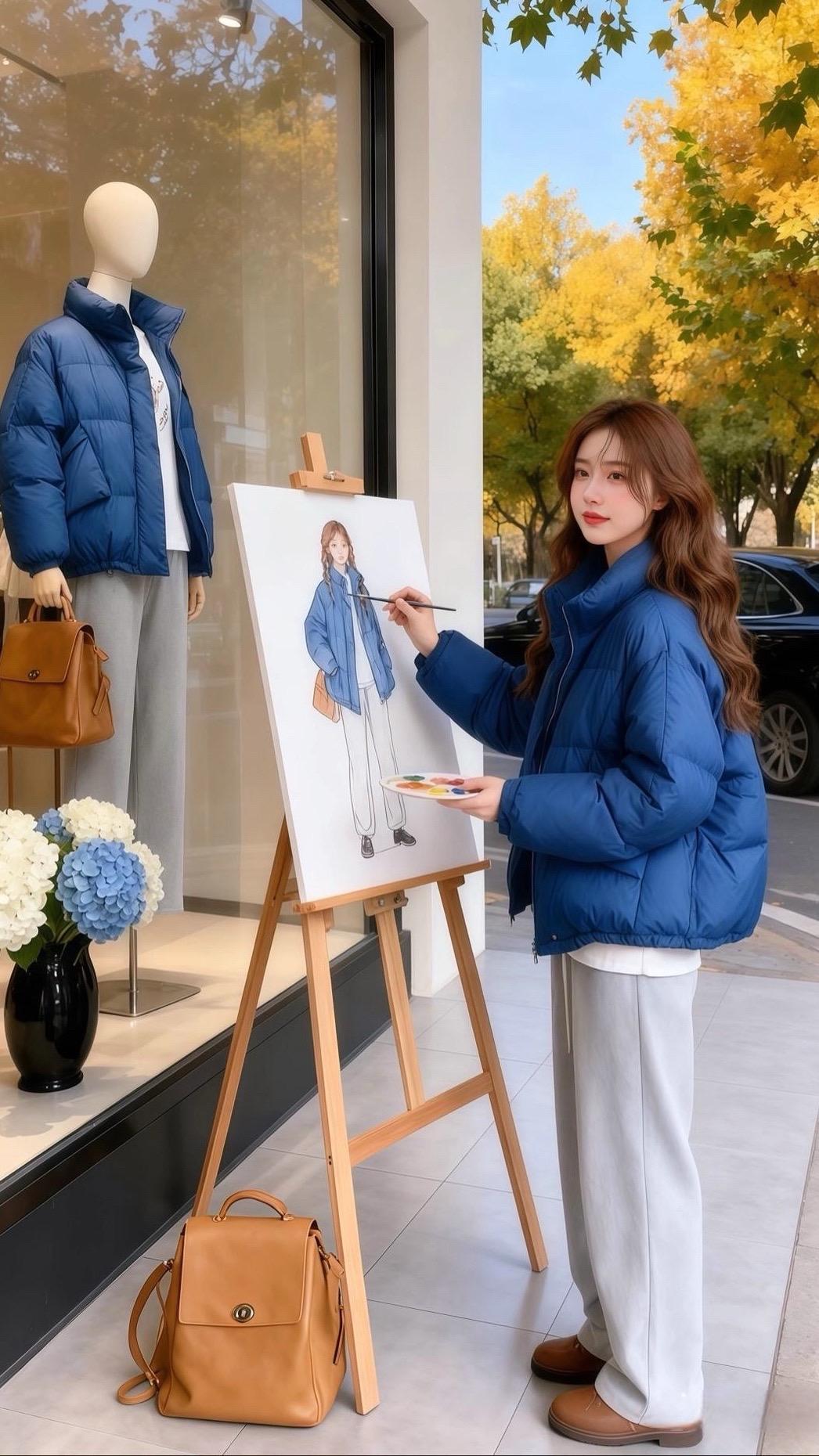 蹲下身撸街角白猫时,棕色的包静静靠在脚边,像她的穿搭风格,简约却藏着细节。偶然支起画架,她把自己的穿搭画进画里,棉服的廓形、卫裤的随性,在颜料里成了都市里的一抹温柔。