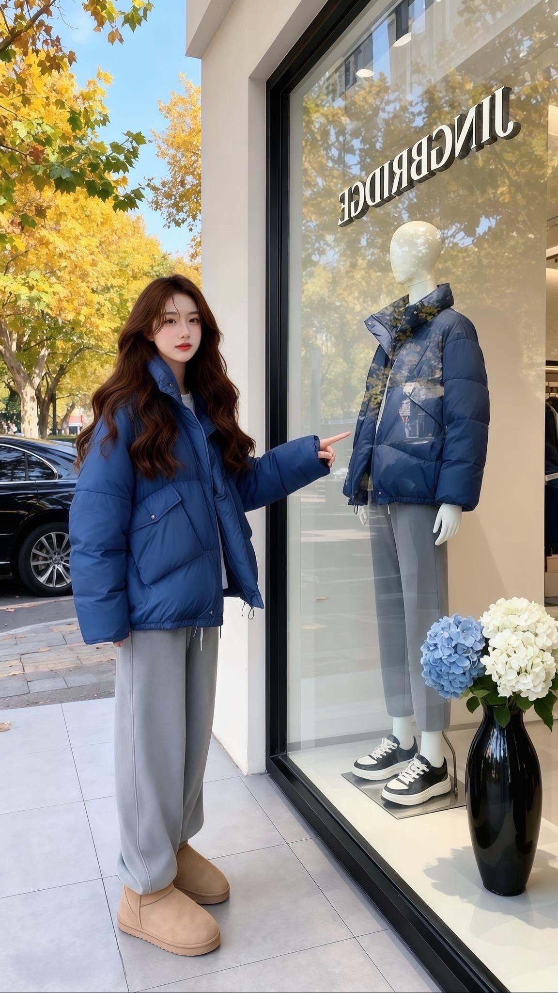 深秋的梧桐叶铺满街道,林晚穿着那件克莱因蓝短款棉服,在“JINGBRIDGE”的橱窗前停下脚步。同色系的模特穿搭像一面镜子,照出她此刻的松弛——宽松的灰色卫裤藏住所有疲惫,米色雪地靴踩碎落叶,发出簌簌的轻响。