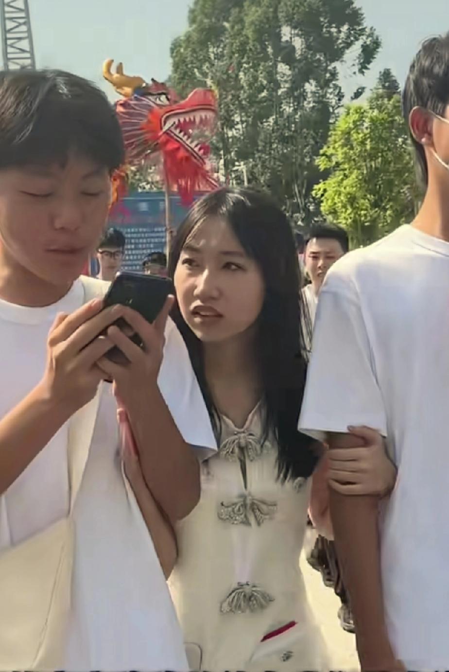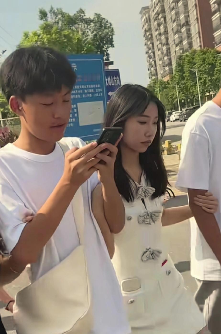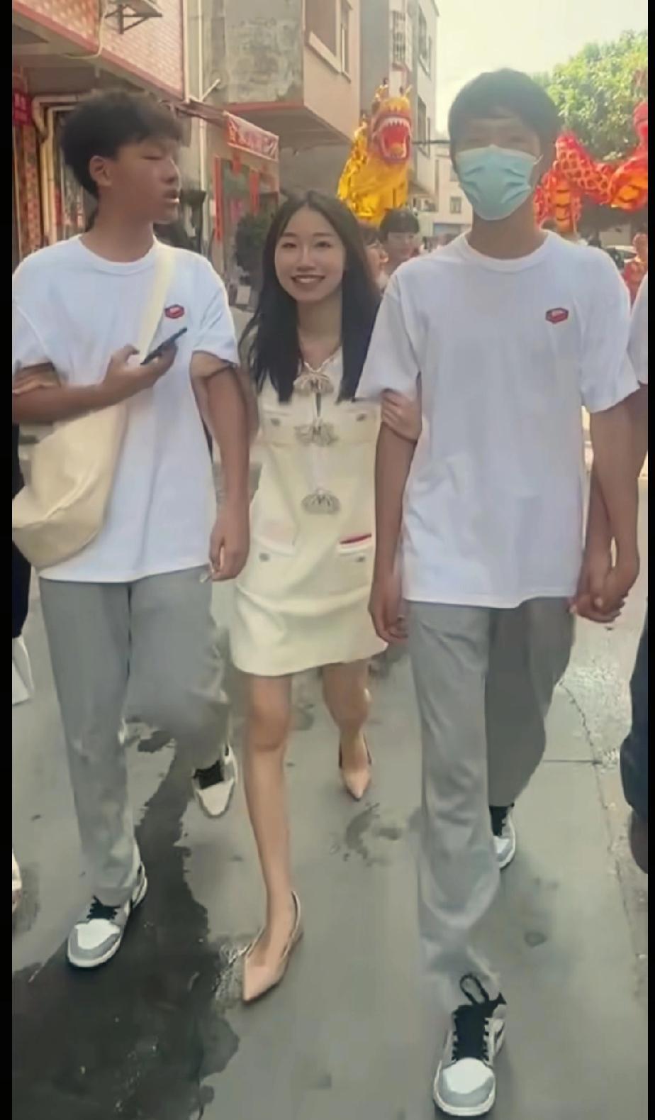 叶锐聪的姐姐与两个弟弟一同惬意地漫步街头。姐姐走在中间,双手分别搀扶着弟弟,此刻
