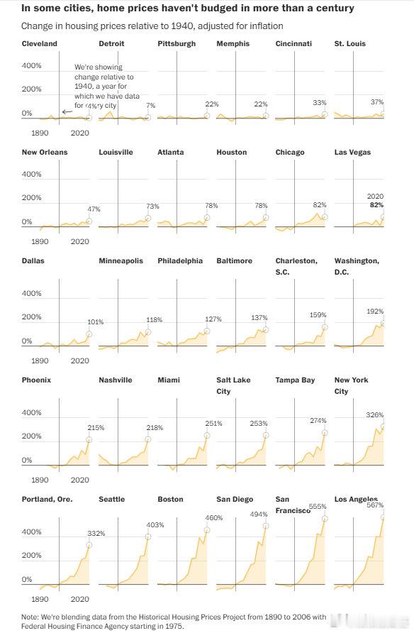 1940年以来,通胀调整之后,美国房价增幅最高的城市:洛杉矶、旧金山、圣地亚哥、波士顿、西雅图、波特兰、纽约