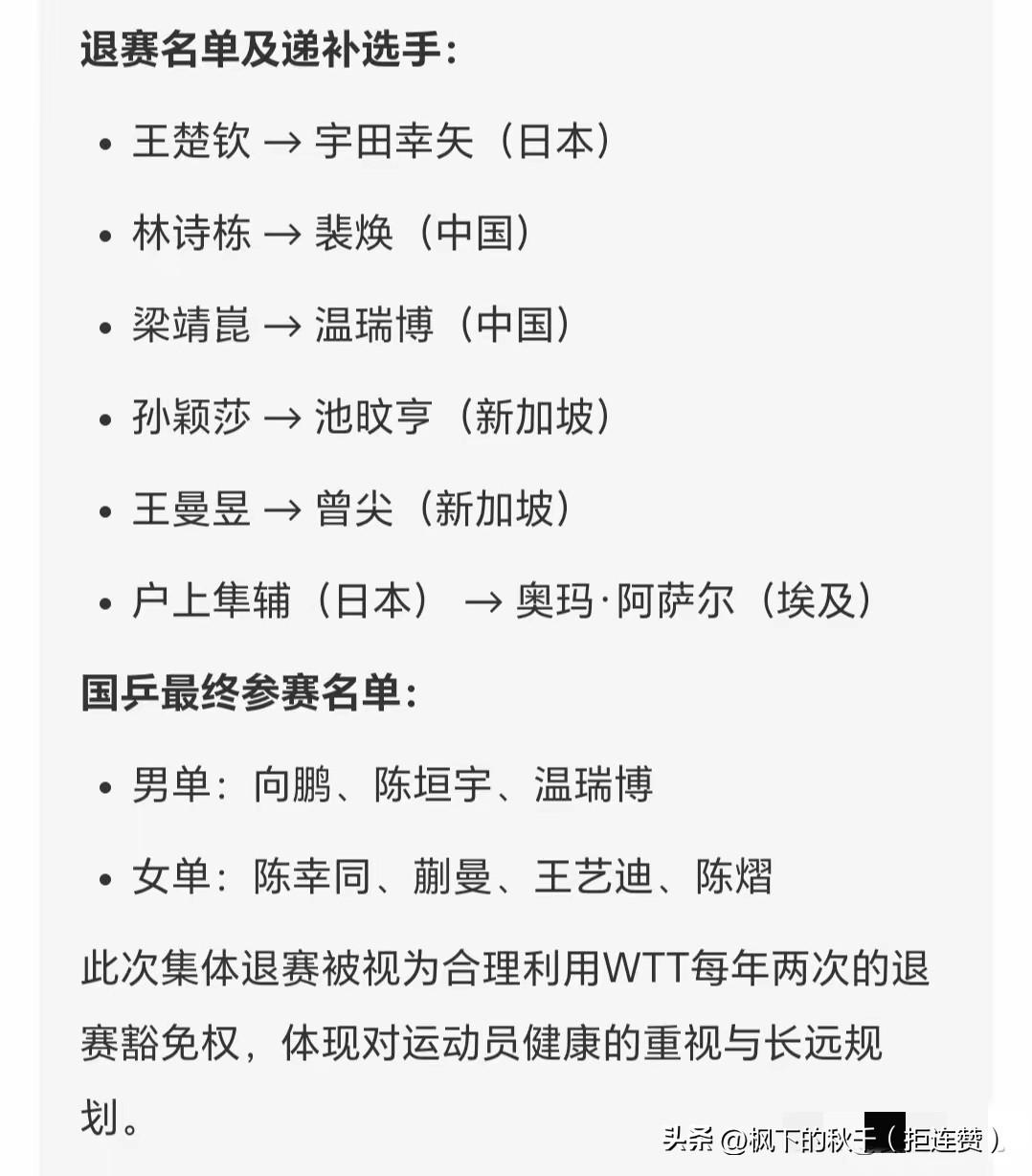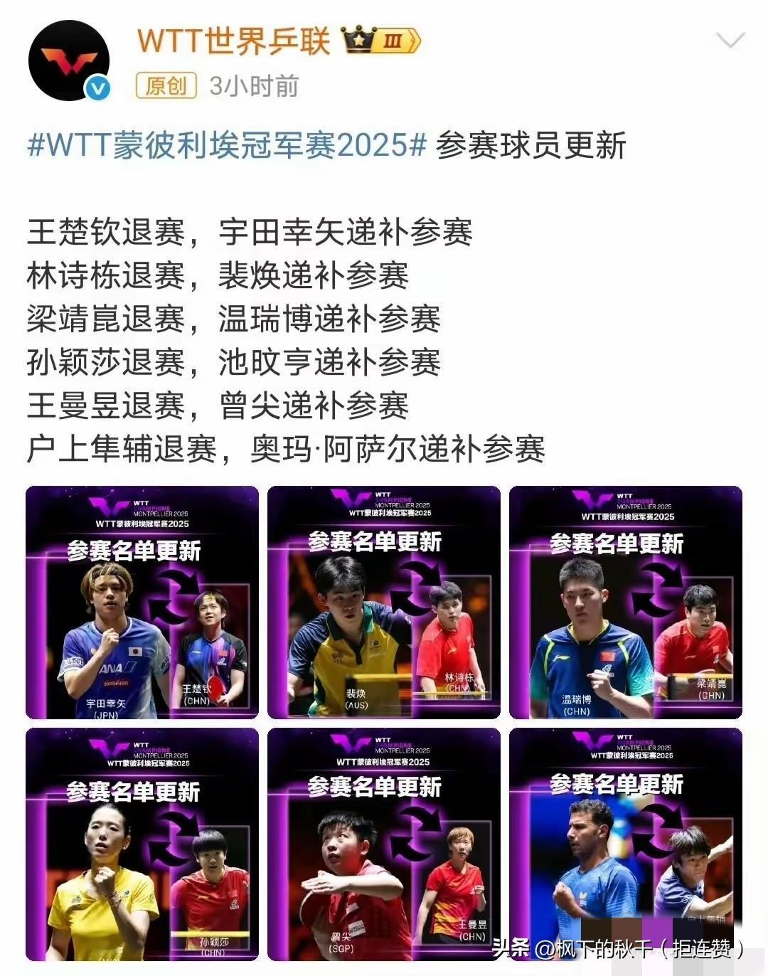 家人们,大新闻!国乒五大主力孙颖莎、王楚钦、王曼昱、林诗栋、梁靖崑居然集体退出WTT蒙彼利埃冠军赛,这消息一出来,乒坛瞬间炸锅! 你说这退赛背后到底咋回事?先看赛程,巴黎奥运会后,他们马不停蹄征战中国大满贯、亚锦赛,身体都快被掏空了,真得歇一歇。而且全运会11月7日就开幕,和蒙彼利埃赛就隔5天,跨国参赛折腾不说,对全运会状态影响也大。全运会可是各省体育实力的大比拼,还关联着奥运选拔,主力们肯定得把精力都放在这上面。 但这退赛操作,其实藏着大好处。一来,给主力们充足时间回血,后续比赛才能火力全开。二来,小将们的机会这不就来了!向鹏、陈垣宇、陈幸同、蒯曼他们,终于能在大赛舞台崭露头角,证明自己。说不定这次比赛,就能杀出几匹黑马,给我们带来惊喜! 在我看来,国乒这决策太明智了,懂得取舍,才能走得更远。大家觉得呢,这退赛是利大于弊,还是有点可惜?来评论区聊聊!