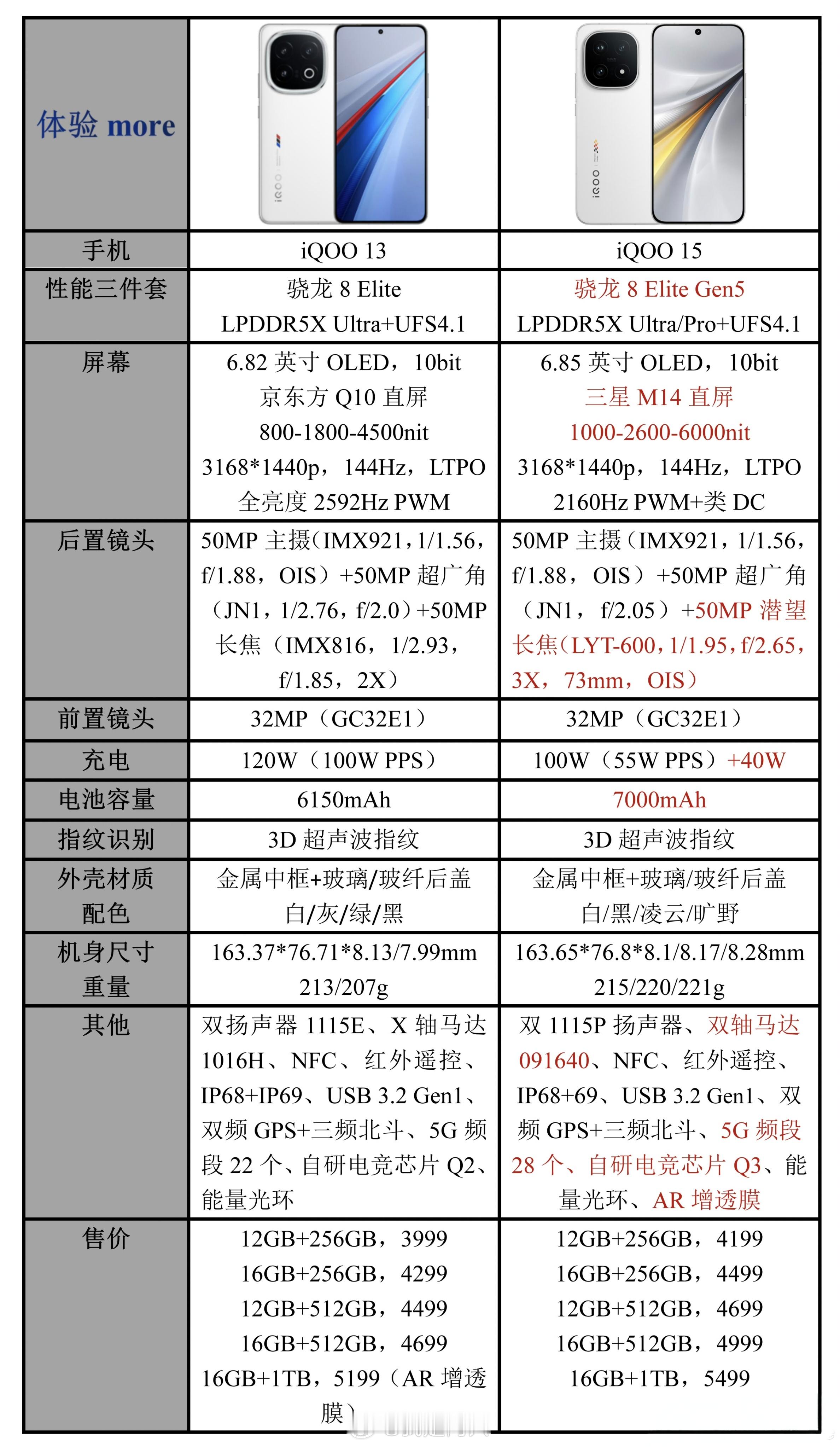 对比iQOO 13,iQOO 15的升级肉眼可见:核心配置大幅强化,上代存在的短板全部补齐,虽价格上涨200-300元,但换来的体验提升远超差价。 iqoo15