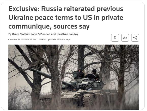 【路透社证实特朗普与普京会晤取消 取消的主要原因是俄罗斯拒绝同意乌克兰立即停火。 据路透社消息人士透露,莫斯科向华盛顿发出了一份机密照会,重申了之前与乌克兰的和平条款,包括完全控制顿巴斯地区。 这一要求与华盛顿和基辅此前拒绝的立场如出一辙,而特朗普则坚持冻结当前前线的冲突。泽连斯基称乌克兰已准备好结束战争 “乌克兰再次表达了结束战争的意愿。我们与美国总统举行了会晤,并同意尝试在当前前线组织对话。 “这是特朗普总统向他的团队发出的信号——也是公开的。前线可以成为外交的起点,”泽连斯基强调。】