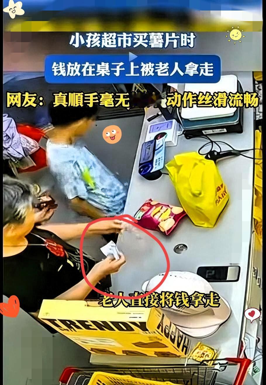 真的气到说不出话! 超市里一个小孩攥着五块零钱想买薯片, 没等结账先把钱放柜台上, 结果被前面结账的老人直接顺走了,动作溜得像早有准备,付完钱还推了孩子一把才走。 孩子发现钱没了的时候,又是摸兜又是翻薯片,眼神里的慌和失望,换谁看了不心疼? 五块钱不多,但那是孩子满心期待的零花钱,是家长教他学会管理的第一笔“财产”,就这么被一个长辈用偷拿的方式毁了。 别拿“成长代价”当借口,这根本不是吃亏长记性,而是让孩子过早见识到本不该有的恶意。 更让人寒心的是,老人的举动里没有丝毫愧疚,仿佛拿孩子的钱天经地义——要是自家孙辈遇到这种事,她还能这么坦然吗? 出门在外看好东西是常识,但我们更该警惕的,是这种披着“长辈”外衣的自私。 毕竟谁也不想教孩子,面对年纪大的人,首先要防着对方偷自己的钱。 你们要是在现场,会怎么帮这个孩子? 或者遇到这种事,你觉得该怎么提醒孩子保护自己的东西?