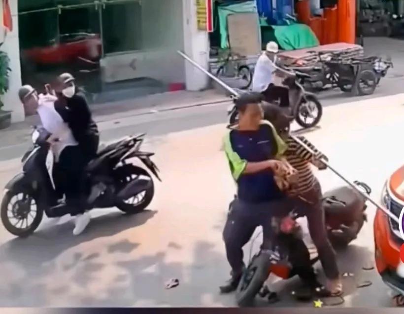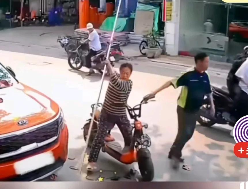 夫妻两人骑电车携带长杆,意外撞到一辆电动车,并打到了后边电动车上的人, 长杆瞬间改变位置,横了起来, 结果路上的电动车纷纷遭殃,躲闪不及都被打到。 这安全意识太差了, 这么长杆骑车真的会出事故的。 网友说,应该拿低点, 或者两边绑个红绳这样显眼点, 容易被人看到, 这么大岁数了,还不懂这些。