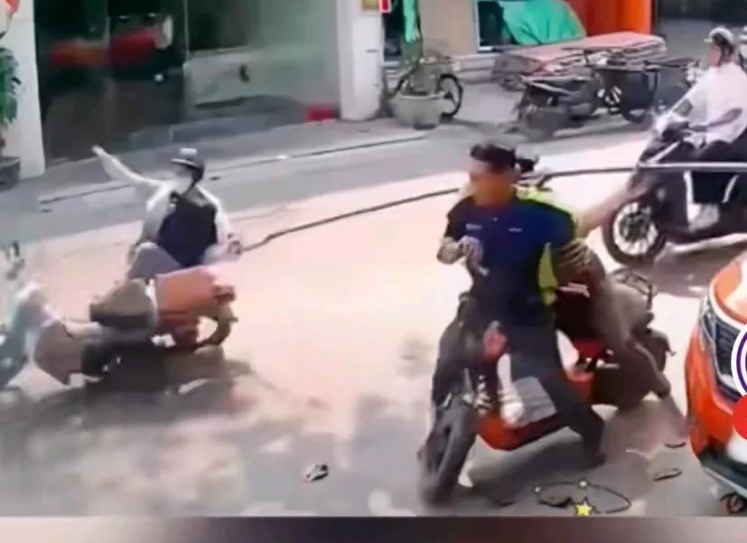夫妻两人骑电车携带长杆,意外撞到一辆电动车,并打到了后边电动车上的人, 长杆瞬间
