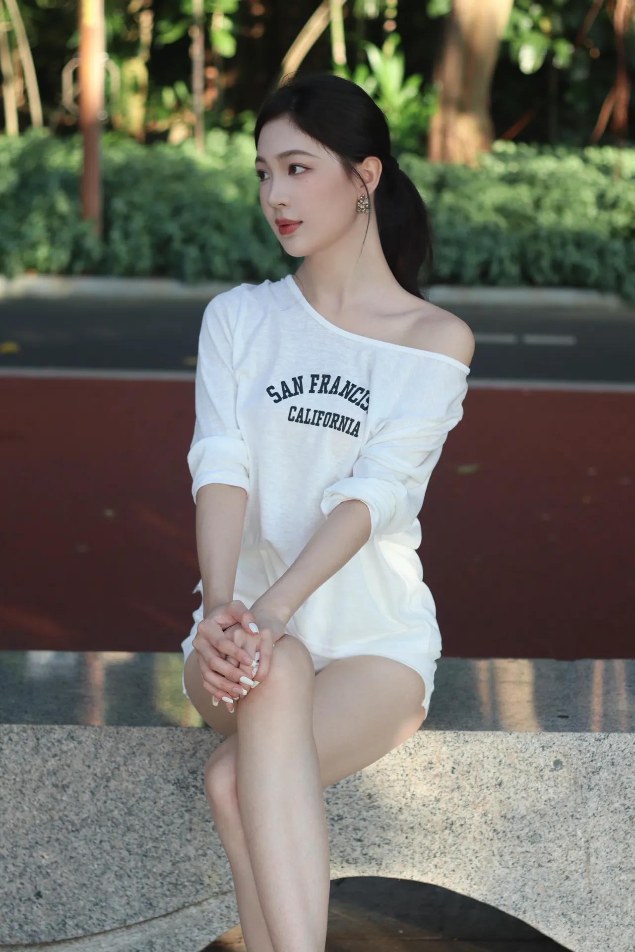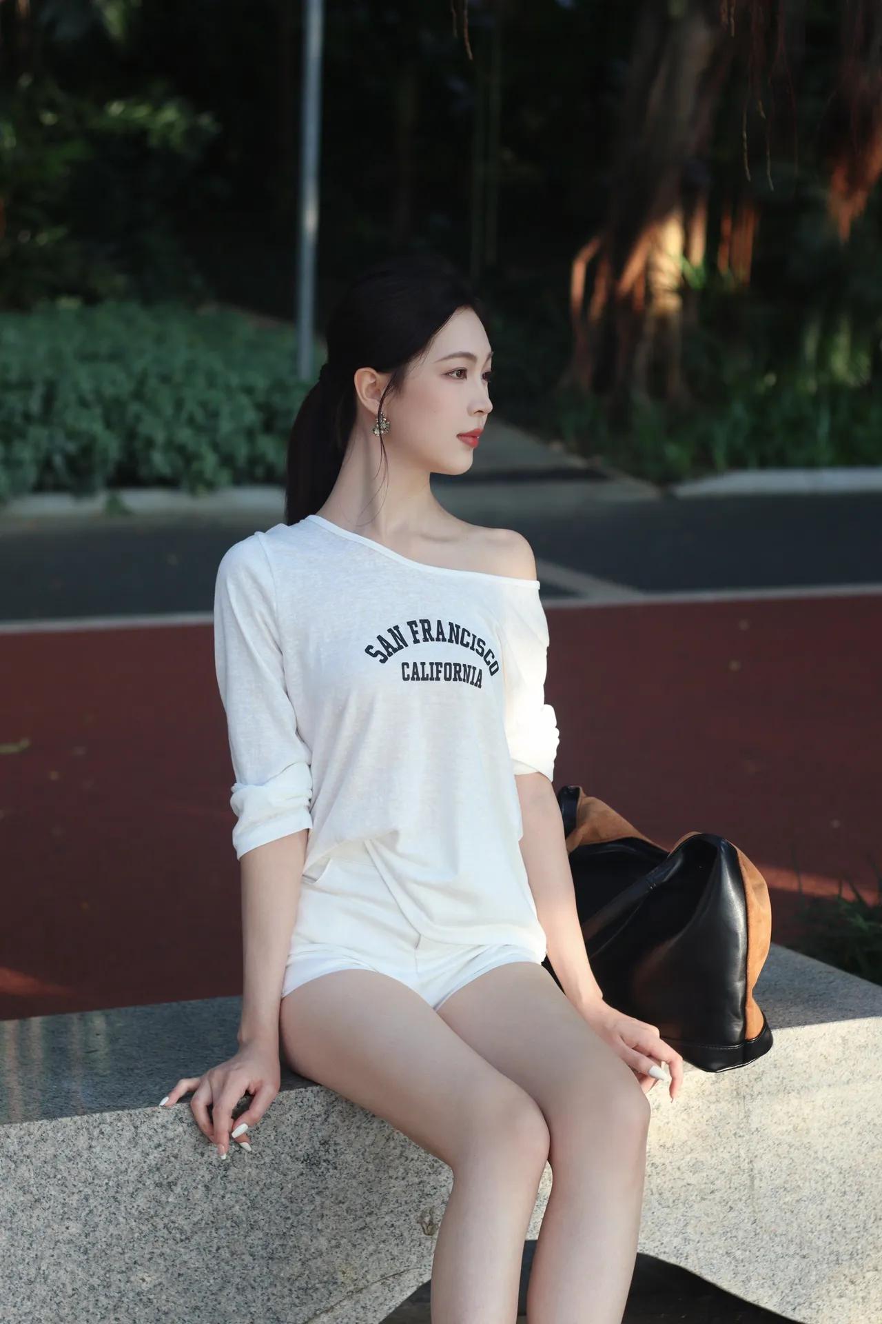 阳光明媚的午后,坐在公园长椅上,穿着“旧金山加州”的白色长袖T恤,享受宁静时光。