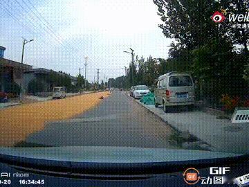 一个农户在马路上晾晒稻谷,直接把双行道变成了单行道,谁料一位车主开车经过时,迎面