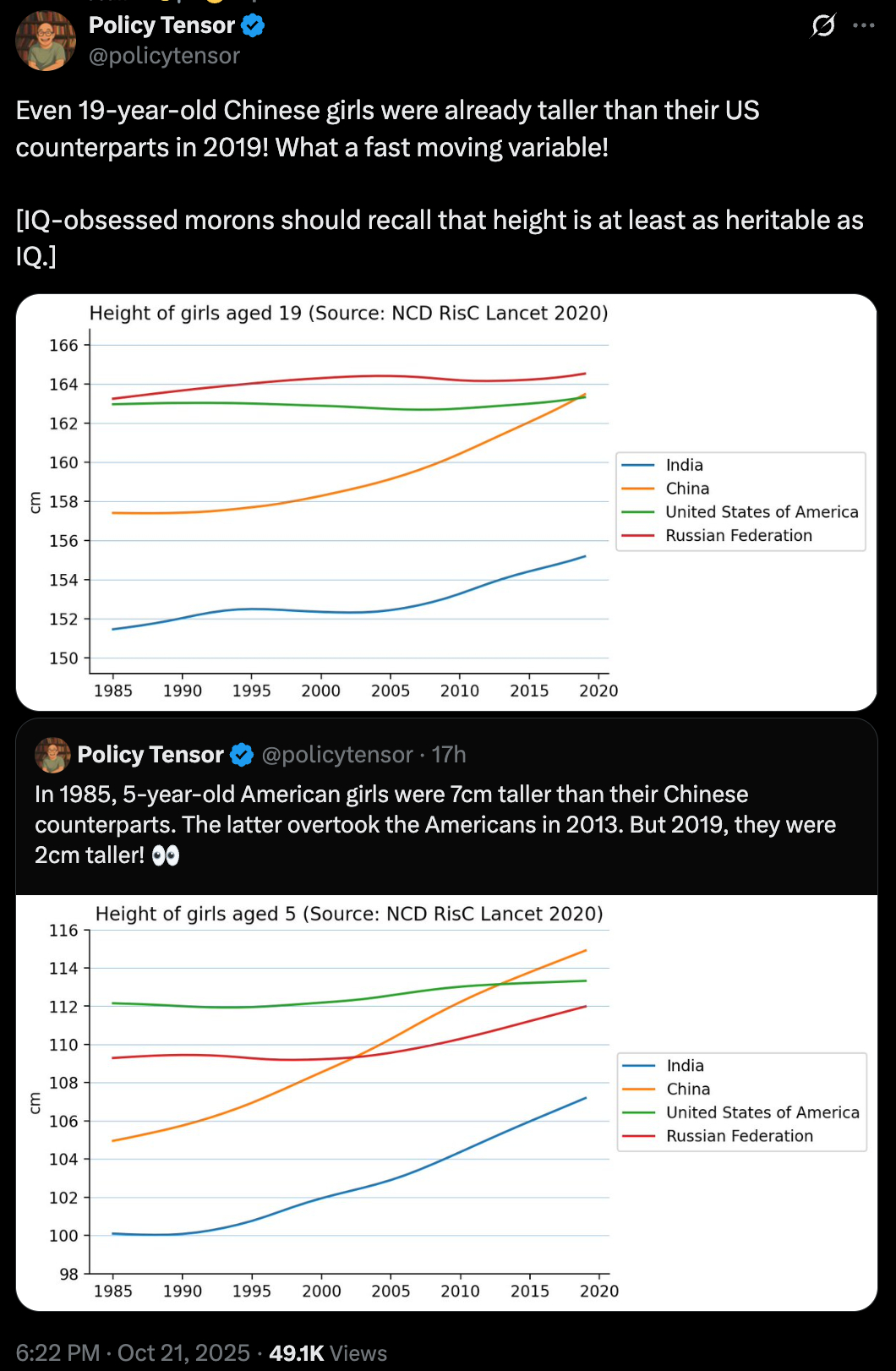 19 岁中国女孩的身高已经超越美国平均了。