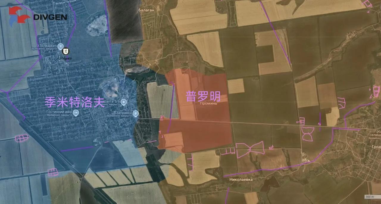 俄军完全控制了季米特洛夫东面的普罗明,意味着俄军开始对季米特洛夫进行贴身攻击了。