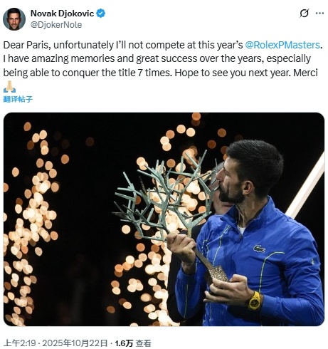 巴黎大师赛德约科维奇退赛 德约科维奇社媒发文:“亲爱的巴黎,很遗憾今年我将无法参加劳力士大师赛。这些年来我在此留下了无数美好回忆并取得了辉煌战绩,尤其是七度加冕的珍贵时刻。期待明年再相逢。Merci(法语:感谢)”