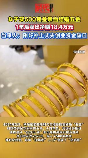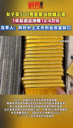 “人怎么能这么聪明!”10月17日,湖南长沙,一95后女子结婚买五金时觉得金首饰不实用,转而购买了500克金条,1年后丈夫创业资金短缺,女子将金条卖出净赚18.4万元,刚好填补了资金缺口,网友:高瞻远瞩! 结婚时男方都会给女方买金首饰,也就是我们俗称的“三金”或者“五金”,也并不是所有女生都喜欢金首饰,有些人就选择用买金条代替三金。 一95后女子和丈夫领完证准备去买五金,她感觉金首饰对她来说不实用,而且首饰的工费比较高,作为投资品来说并不划算,于是,女子和丈夫转而去银行花26万买了500克金条来代替五金。 一年之后,丈夫创业资金短缺,天天唉声叹气,女子得知金价飞涨,赶紧将500克金条拿去卖,没想到这一斤金条竟然净赚了18.4万元,刚好能补上丈夫的资金缺口,夫妻俩高兴不已。 当初买金条时女子根本没预料到会大涨,只是在她的观念里金条比较有安全感,没想到竟然成了他们小家庭的“及时雨”! 不少网友称赞女子高瞻远瞩,如果当时买的是金首饰,可能就赚不了这么多了,不过萝卜白菜各有所爱,不管是金首饰还是金条,自己喜欢就好! 信息来源:《女子卖26万结婚五金18.4万》时代邮刊