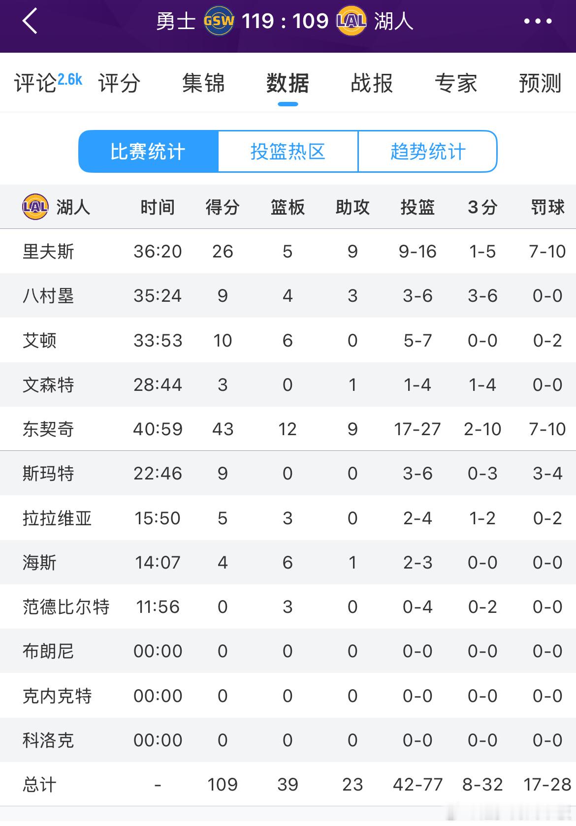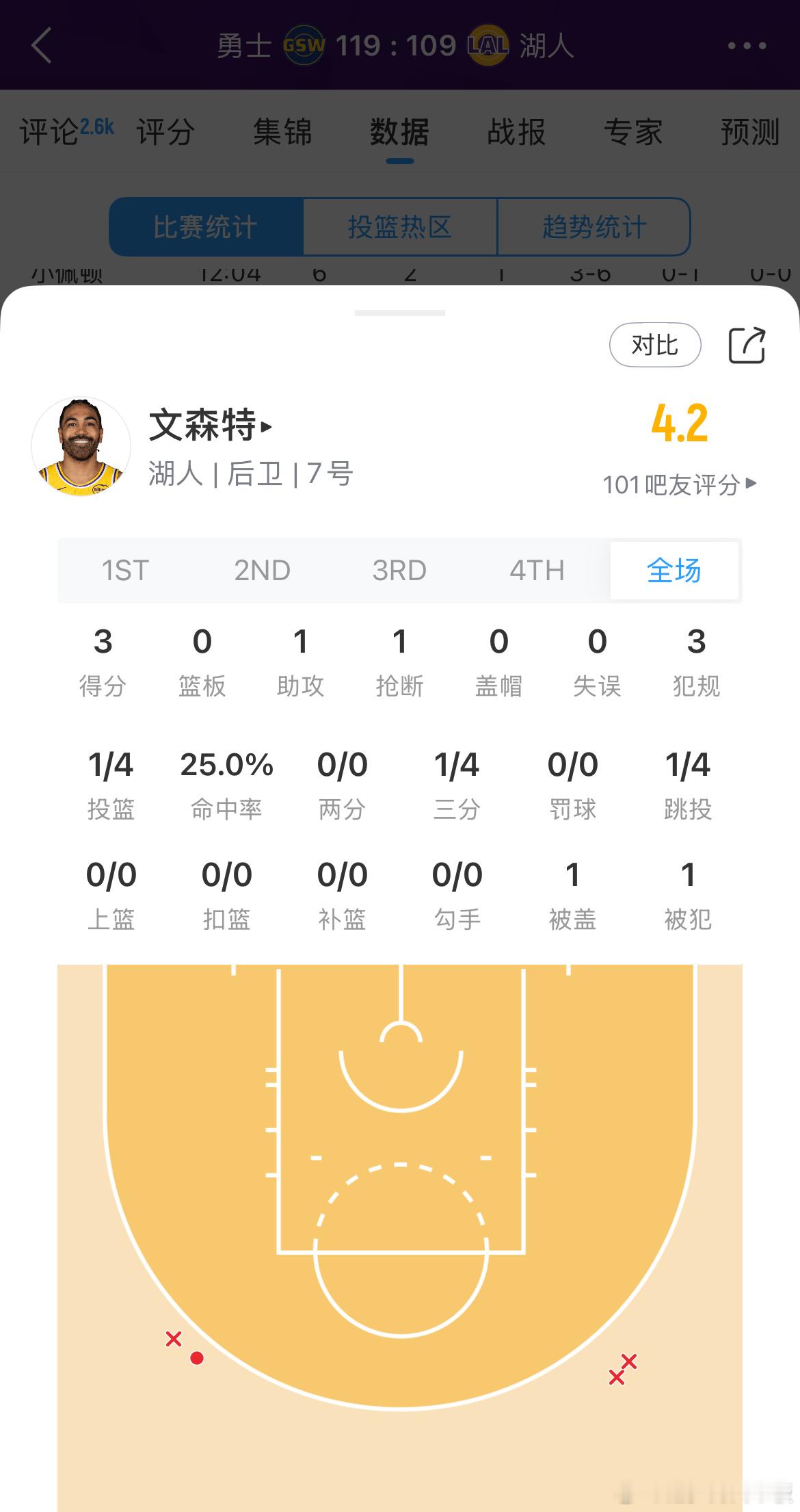 文森特在首发的存在感不理想,29分钟时间仅得到3分1助。勇士vs湖人