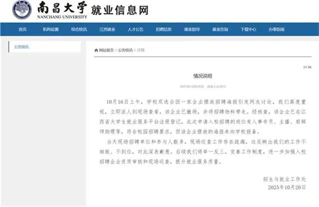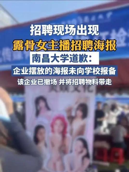 南昌大学招聘现场现露骨女主播招聘海报,引发热议。网友质疑招聘“擦边”主播找到高校来了,校方回应,该海报没有向学校报备,学校已让企业撤场并致歉。 10月16号的南昌大学,一场本该聚焦求职的秋招双选会,却因一张海报搅得满城风雨。 有学生在现场拍了张照片发到网上,一家招聘主播的企业展位前,大幅海报上的几位女性衣着格外清凉,部分款式接近暴露,在双一流高校的校园里,显得格外刺眼。 这张照片很快在社交平台传开,质疑声铺天盖地。 有学生留言说,大学拼搏了四年,盼的就是在正规校招上找到靠谱工作,校园本该是最讲文明的地方,突然出现这样的海报,心里特别不舒服。 面对质疑,涉事企业的回应更让人不满。 他们说海报走的是“可爱清纯风”,不会引导擦边内容,可又补充“主播有身材优势想展示也无妨”。 查一下这家企业的背景更让人意外,2022年才成立,注册资本1000万元听着不少,2024年参保人数却只有6人,规模小得可怜。 有知情人透露,这类传媒公司常藏着“天价违约金”陷阱,签了合同想走都难,有些公司甚至就靠违约金赚钱。 10月20日,南昌大学招生与就业工作处出面回应。 说明里写着,涉事企业确实按规定完成了注册,招聘主播的岗位也符合要求,但那张露骨海报没提前向学校报备。 说是现场巡查时没盯紧才出了问题,已经让企业撤场,也向学生和公众道了歉,后续会把审核和巡查做得更严。 可这个回应没能平息不满,校招现场那么多学生,企业展示的物料直接影响大家的求职判断,怎么能只查岗位合不合规,却把海报这么关键的东西漏了? 说到底,这事儿不是“巡查疏漏”这么简单。 现在不少企业招主播时,总想着走捷径,不琢磨怎么靠岗位前景吸引人才,反倒一门心思搞低俗营销,把直播间里博眼球的套路,原封不动搬到了校园里。 他们忘了,大学校园不是街头的广告牌,也不是网络直播间,这里是培育人才的地方,每一个进入校园的招聘行为,都该符合育人的氛围。 对高校来说,就业压力大确实是现实,想多给学生争取岗位机会的初衷可以理解,但绝不能因此放松对招聘质量的把关。 校招的审核环节,不能只停留在企业资质和岗位名称的表面核查,像招聘海报、宣传语这类直接影响校园氛围和学生认知的物料,必须划定明确的内容红线,提前审核、现场巡查都不能缺位。 校招从来都不只是“找工作”的渠道,更是连接学校育人与社会用人的关键环节。 年轻人常说“脱下长衫”,但这从来不是要放弃职业尊严。 校招的核心是传递正确的职业价值观,低俗擦边的招聘方式,不仅会误导学生对职业的认知,更会破坏校园的育人氛围。 学校的致歉和整改承诺是第一步,但更重要的是守住底线,校园招聘可以包容不同岗位,但绝不能包容低俗擦边。 只有把好审核关,杜绝低俗营销进入校园,才能让校招真正回归育人与育才的本质,给学生一个健康的求职环境。