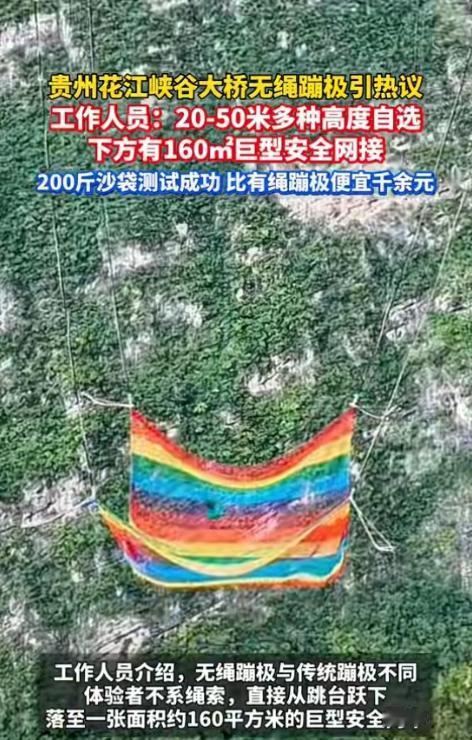 贵州花江峡谷特大桥推出了最新无绳蹦极! 是的,你没有听错,无绳蹦极!桥距离地面高625米,相当于距地面230多层楼高。 顾客:“这个能保证落到网上吗?” 商家:“嘿这话说的,落不到你回来找我,假一罚十。” 这么高,落网上着网的位置不对,至少也会弄个颈椎腰椎骨折吧,多观察一下再说,要不文旅局长先跳为敬! 审批者第一个跳,董事长第二个跳,财务总监第三个跳,总经理第四个……依次类推,发起者逐个参与试验,安全后再面向大众开放。 大家觉得呢?