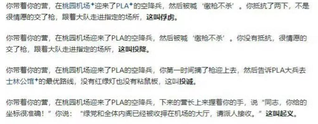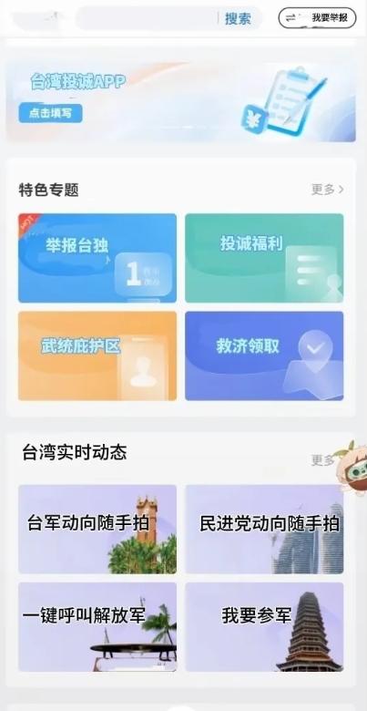 这个好,所谓识时务者为俊杰! 对面的,机灵点,不妨早点填好表格,方便一键投诚。 要不然,到时候死了都没地方领抚恤金去。 “你带着你的营”这个就有点深度了!这个也是信息战,心理战,这就对了,不能总让1450进攻,我们要反击!诸如此类的APP都应准备好,一旦梧桐就上线。虽然不一定有大用,但总好过索骥无图! 还要增加快速办理身份证的通道,政审后拿到身份证才算中国人,其他至少是待考察。希望统一之后,台湾尽可能短时间建立党委,变成真正意义上的省级单位! 大陆人才济济!这个APP好啊,应该大力宣传推广,让台湾人提前有个地方投诚。大家觉得呢?