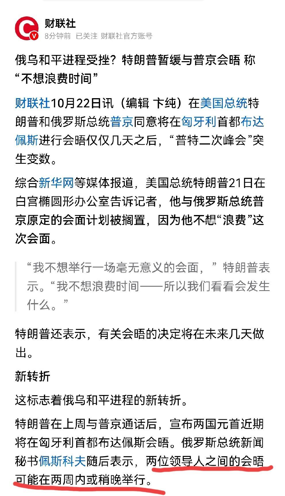 欧洲拒绝摆上桌面,老美还能如愿以偿? 为什么取消与大俄在布达佩斯的两国首脑会面, 最根本原因在于两点: 一,老美现在的国际控制力,肉眼可见的下降了。 对欧洲这些盟友们的拿捏,也没有他们自己想象那样易如反掌。 二,美与欧洲之间的诉求出现了严重分歧。对美只是利益,对欧却是命运攸关。 由于欧洲盟友的强烈反抗,所以美暂时还没拿够计划中的筹码。 会面的本质就是双方要拿出对等的利益进行交换,一方筹码还没拿齐,只能取消或者推迟了。