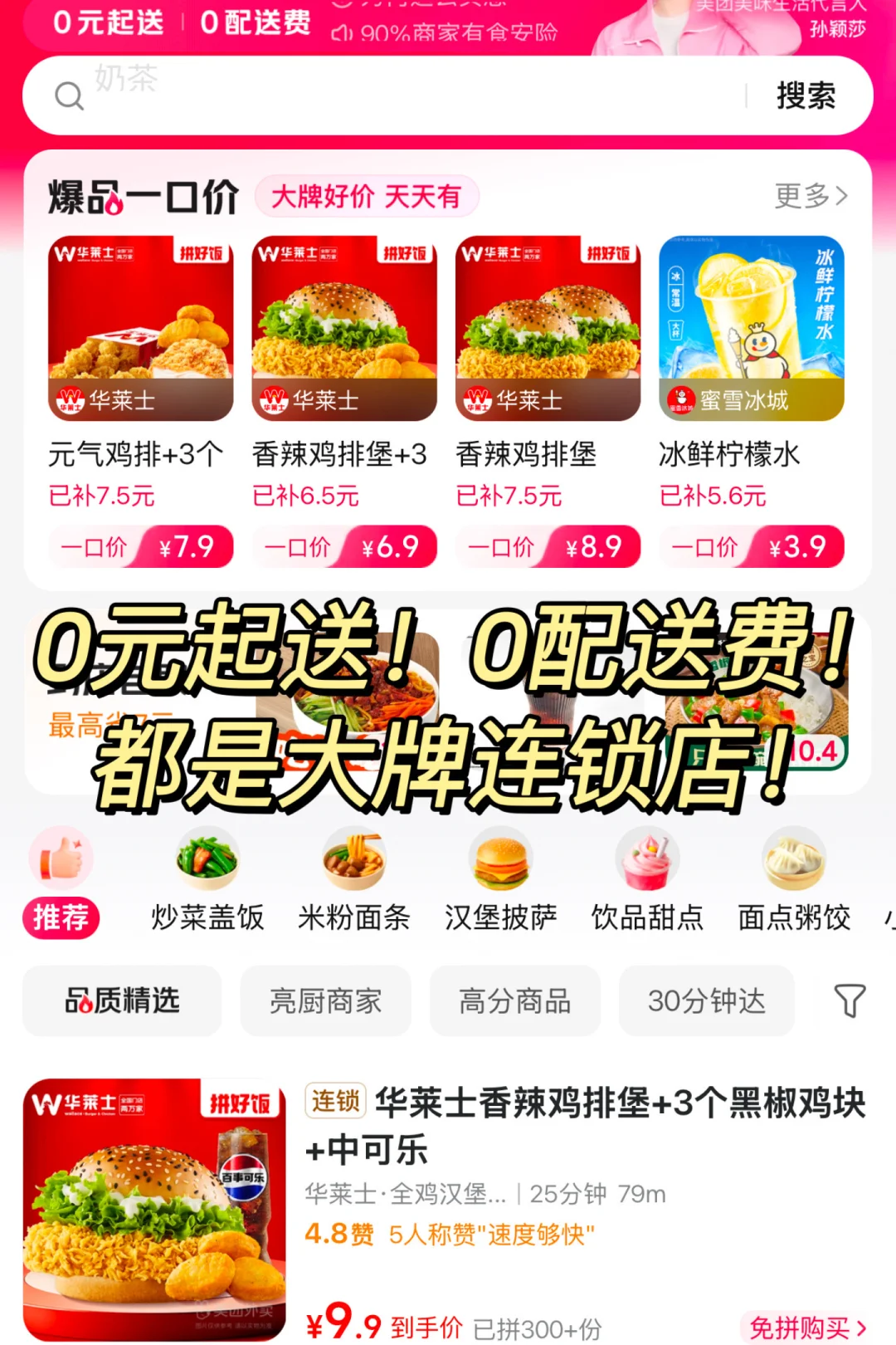 打工人下班的快乐,就靠美团拼好饭买了! 下班到家原价点晚饭也太肉疼了!还好我有拼好饭! 不仅0配送费!0元起送!而且不用凑单,完全就可以吃好吃饱! 华莱士、袁记云饺、正新鸡排、蜜雪冰城…不仅有都是连锁大牌,还有品质小店有保障!而且想吃啥都有!打工人或者学生党闭眼冲不心疼! 不知道咋点的宝子,直接抄我这份晚餐清单作业! 1️⃣:先打开美团/美团外卖App搜【拼好饭真香5039】! 6.9/9.9元就能吃到汉堡套餐,3.9/6.9就能拿下咖啡奶茶,9.9能点米面套餐 像我今天点的这些: 2️⃣:4.07元起喝上蜜雪冰城棒打鲜橙!满满的果香!酸酸甜甜贼好喝! 3️⃣:9.9元的华莱士汉堡+鸡块+可乐套餐!汉堡控表示太满足了!这组合真的吃一百次都不会腻! 4️⃣:7.9元起吃正新鸡排!满满的肉肉!外脆里嫩的鸡排真的一口上头! 5️⃣:9.9元起吃袁记云饺鸡肉云吞干拌面!份量真的太足了!吃完真的很管饱! 6️⃣:10.9元起吃塔斯汀汉堡+翅根套餐!汉堡肉肉超多!真的巨巨巨好吃! 7️⃣:4.48元起喝蜜雪冰城珍珠奶茶!个位数的奶茶!一整个喝过瘾也不肉疼! 本打工人真的太爱拼好饭了!每天都可以换着花样吃低价品质外卖! 平时点一次晚餐的钱,现在能点两三次!省下来的钱都可以多喝两杯奶茶了!赶紧存好攻略!下班吃饱吃好就靠它了!