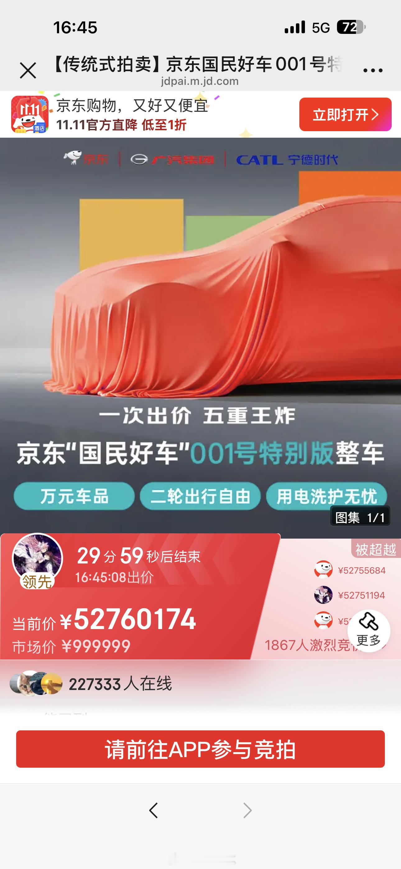 京东001号国民车20万人参拍才半小时就20万人参加出价,这就是大平台的力量吧