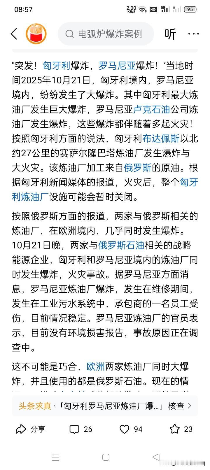 爆炸的不是俄炼油厂! 俄罗斯对乌克兰的战争,已经打了超过三年半的时间,现在仍然是打的如火如荼,几乎每天都在惊天动地,没有任何结束的迹象。 在西方国家对俄罗斯的能源出口进行严厉的大力制裁下,欧洲现在只有为数相当少的炼油厂,仍然在使用俄罗斯的石油进行加工提炼,其中可能最主要的就是匈牙利、罗马尼亚使用俄罗斯石油的两家炼油厂。 然而,就是匈牙利、罗马尼亚使用俄罗斯石油的两个炼油厂,在10月21日接连突然发生了巨大的爆炸,这好像使战争又向前迈出了一步,有了新的进一步的发展。有人分析,这好像有可能是乌克兰向这两个炼油厂发射无人机或导弹,但仔细想想,可能性不大。因为这两个国家都是北约成员国,乌克兰似乎不会冒这么大的风险,让大力支持乌克兰的北约国家分裂。但究竟是谁爆炸了匈牙利和罗马尼亚使用俄罗斯石油的炼油厂,而且这种情况显然用偶然事件或事故无法解释,目前只能说不清楚。但估计最有可能的似乎是地下的反什么的组织,从空中进行袭击的概率不大,因为这容易被北约的空中监控发现。 但无论如何,这无疑是对目前正在使用俄罗斯能源的国家的一个惊心动魄的警示,你尽可以使用权力反对停止使用俄罗斯的能源,但破坏了你使用的必备设施,又抓不到实施行动的人,或者抓到的人并无决定性的作用,又能怎么样呢? 总之,只要战争不结束而继续进行,发生意想不到的事情的概率就很大。