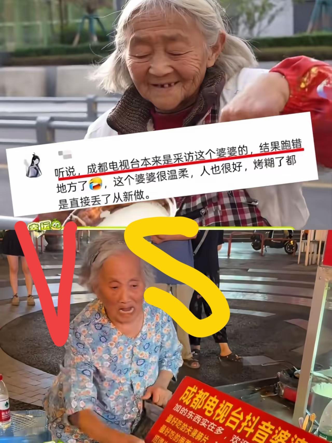 现在终于搞懂为什么态度恶劣的婆婆能火?反而慈眉善目的却无人问津?原因竟然是当初成都电视台采访蛋烘糕老婆婆时,记者当时竟然走错场了! 本来是应该去双流的十陵的善良婆婆,结果记者失误跑到了建设路采访这个不爱卫生的恶婆婆,当时这建设路婆婆还一愣一愣的。心里在想我是谁?我在哪里?她们能干嘛呀? 她就这样无缘无故的接到了这泼天的富贵, 可是她却不珍惜。又不讲卫生,又要骂人! 现在大家也都知道了,所以我们还是要去支持一下正版的婆婆不能让她的善良白费,听说她卖给学生都只收半价,而且她的蛋烘糕都是120g左右。比用内裤当抹布的婆婆用料足太多了。