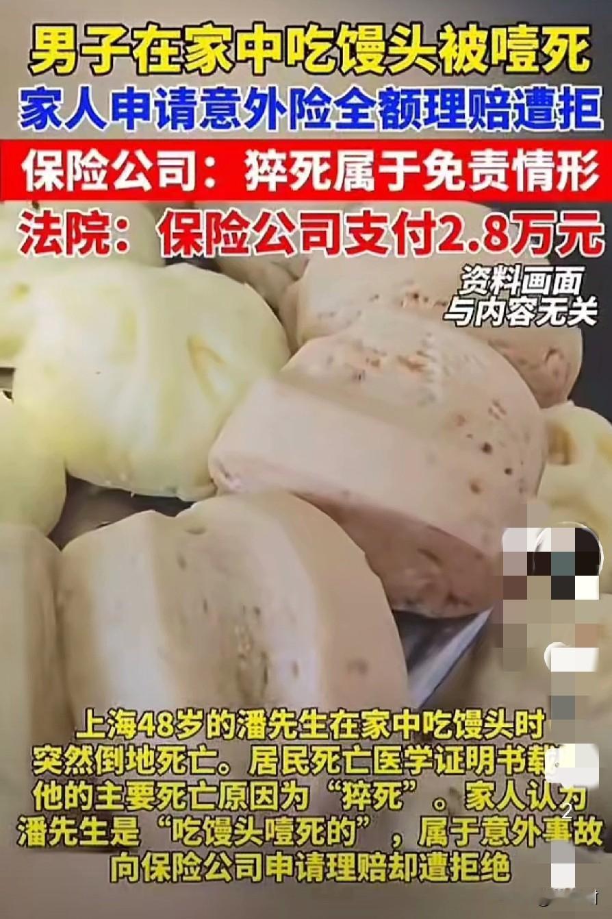 千万记住了各位,吃东西不小心噎死了,不属于意外险,保险公司不赔的。 上海一48岁的潘先生,在家里吃馒头时,不小心噎住,奈何家里无人,竟然被活生生噎到,不幸离世。 死亡报告记载该不幸的男子,为“猝死”,不算意外事故,保险公司拒绝赔付,说“猝死属于免责情形”,意思说不是外界因素发生的意外,是身体不好导致的病因才逝去,所以不赔偿。 尽管后面法官宣判,保险公司还是要支付2万八的赔偿,但这场官司引发了热议。 吃东西噎死不算意外,那到底怎样的意外才算在正经的赔付里?那这意外险买来意义何在,不就在突发情况下的意外保障吗? 这保险看来道门太多了,解释权总在对方手里,意外不意外都是别人说了算,大家买保险,多斟酌吧。 (图片来自网络视频)