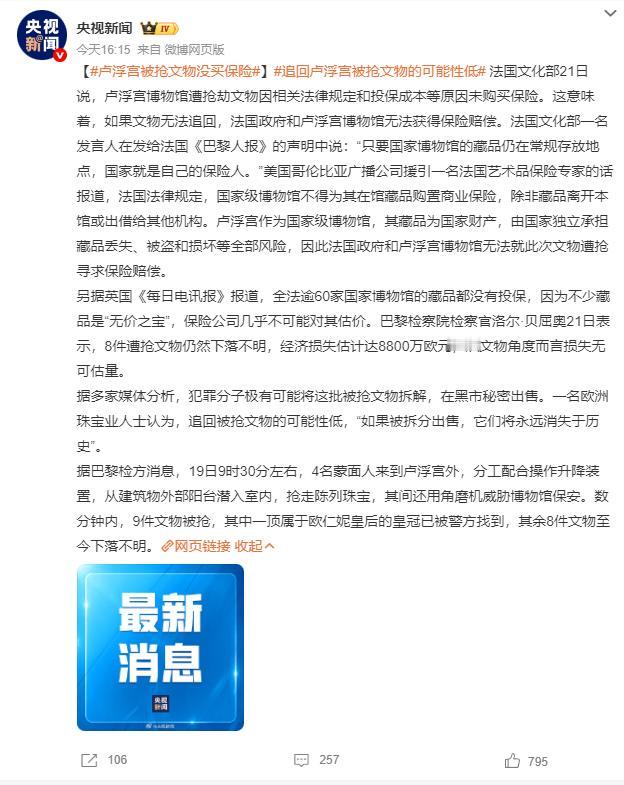 卢浮宫被抢的文物可能回不来了,甚至连赔偿都可能没有。 不得不说,这次法国人太松弛了! 卢浮宫秒变提款机,这一次可真是栽了一个大跟头。 明明放了那么多宝贝,偏偏安保措施不是一般的差,居然能被人明晃晃地拿走那么多东西?更离谱的是,因为根据法律相关规定,这些文物根本买不了保险,一旦追不回来,法国就得自己承担损失了。 而且根据专业人士评测,应该也追不回来了。 这些人这么熟练,很有可能在偷盗24小时内就运到黑市,然后将珠宝切割重组,想要找回来简直就是天方夜谭。 到时候就算抓到了主犯也没用,珠宝早就不知道被销到什么地方去了! 说起来以前电影里也有差不多的情节,但是谁会信呢?现在科技这么发达,居然还能在眼皮子底下被偷走了? 现在回头看“卢浮宫”这三个字都有点离谱了,要是一直这样的安保,里面的宝贝未来还能剩多少?以后不会真的就剩个宫吧? 你怎么看待这件事?