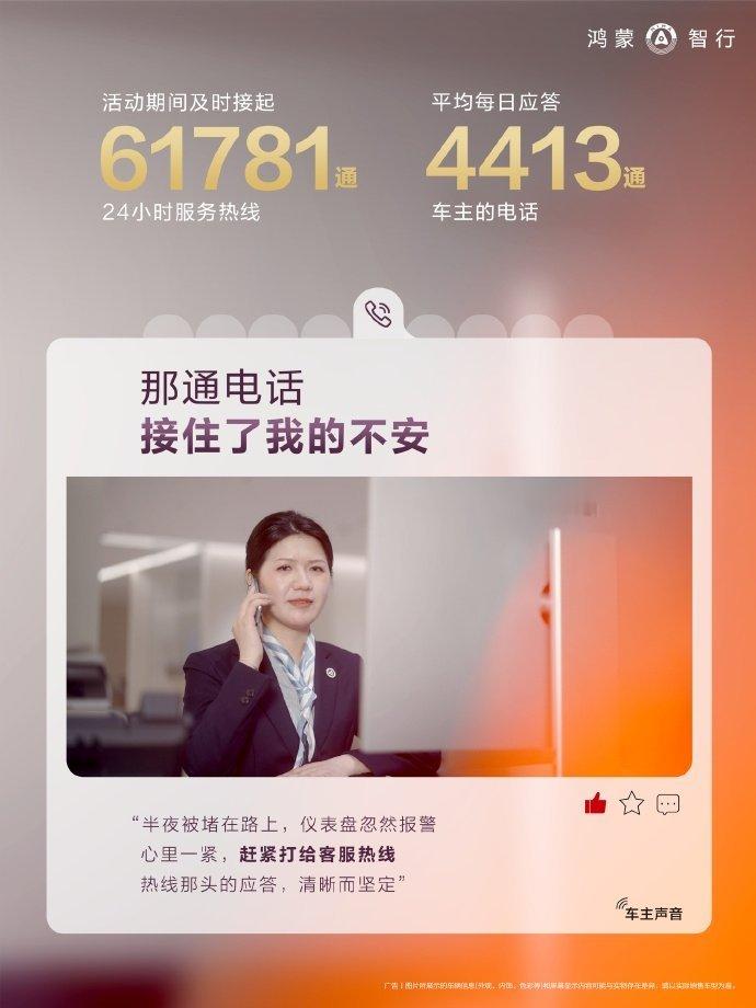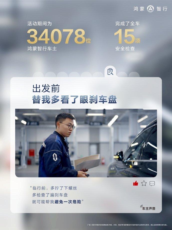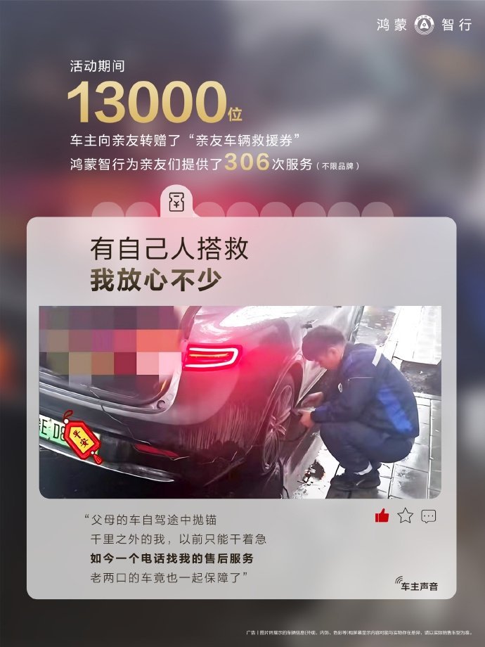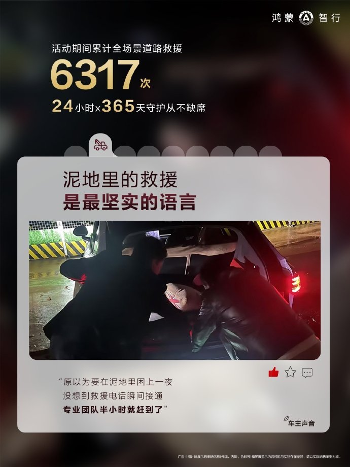 光国庆假期,鸿蒙智行就提供了道路救援 6317次,星夜服务3429次,接听了24小时热线超6万通,为34078位车主完成全车安全检测。