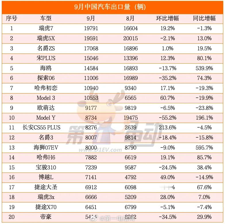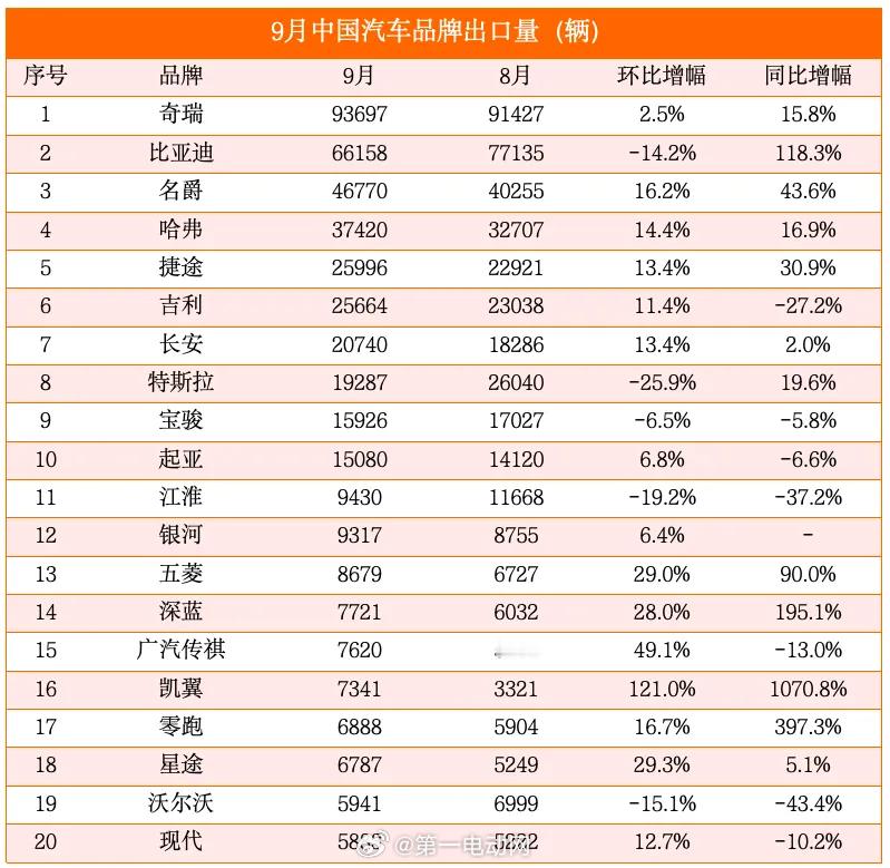 【9月中国汽车出口榜:奇瑞逼近10万辆蝉联冠军,银河/深蓝/零跑成黑马】📈整