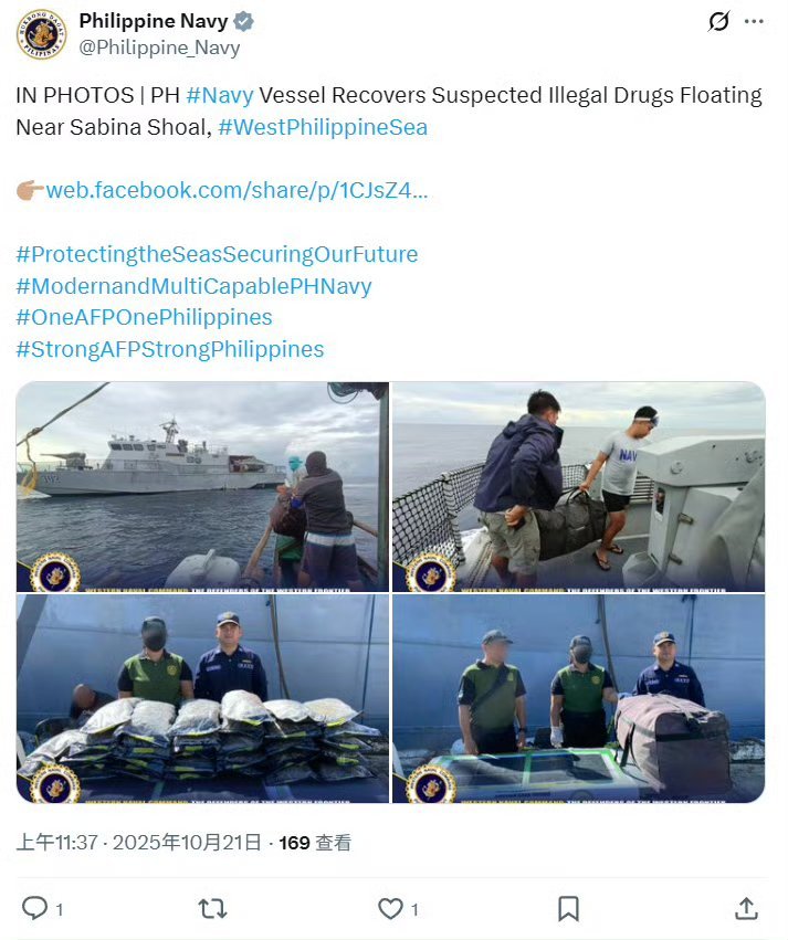 新加坡联合早报10月21日晚报道:“菲律宾当局10月21日说,一艘菲律宾海军军舰