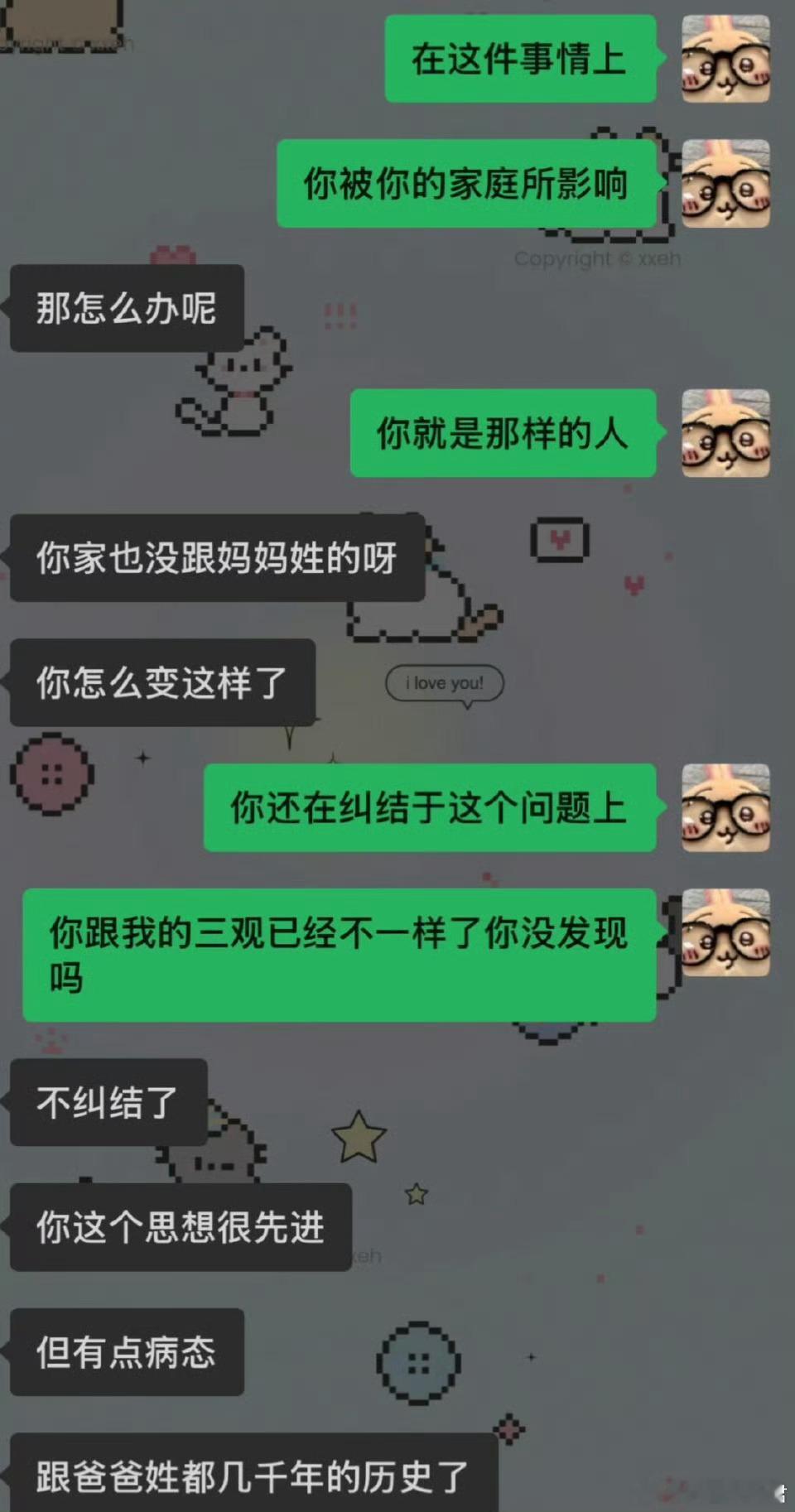 还好分了,孩子跟你姓,将来上学补课出国留学花销是姥姥姥爷出么?你崇尚的自由老美,孩子也是跟妈姓么?再说了,孩子跟你姓,孩子他爸每天都得怀疑这娃娃是不是自己的