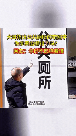 大哥是不是太挑剔了? 大哥指出公共厕所的错别字,我看了半天也没看出这几个字哪个错了?虽然这几个字不规范但也应该没有错吧,无论怎么都比那些用字母,动物标识的好多了,大哥是不是太挑别剔了?有网友称:不影响看懂就好!朋友们你们看出错在哪里了吗?