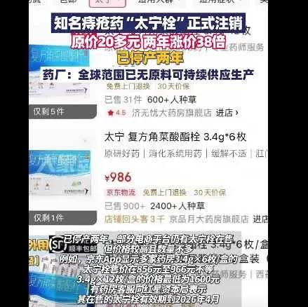 一盒痔疮药从23元飙到966元,你敢信?这不是炒作,是太宁栓停产后的真实惨状!孕妇,肛裂患者,过敏人群直接傻眼!因为这是他们唯一能用的救命栓。 药停了,监管慢了,市场却疯了!原料枯竭本是天灾,但囤货炒价38倍简直是人祸。网友炸锅!有人说硬扛呗,可孕妇能硬扛吗?肛裂患者能硬扛吗? 民生保障的底线,恰恰是看如何对待少数人。今天是小众痔疮药,明天可能是其他救命药。每一次涨价,刀都砍在最弱势的人身上。 别再让市场调节成为收割的遮羞布!稀缺药清单,价格干预,严打囤货…这些措施不该等出事了才补窟窿。毕竟,用药安全不该是奢侈品,而是最基本的民生底线。
