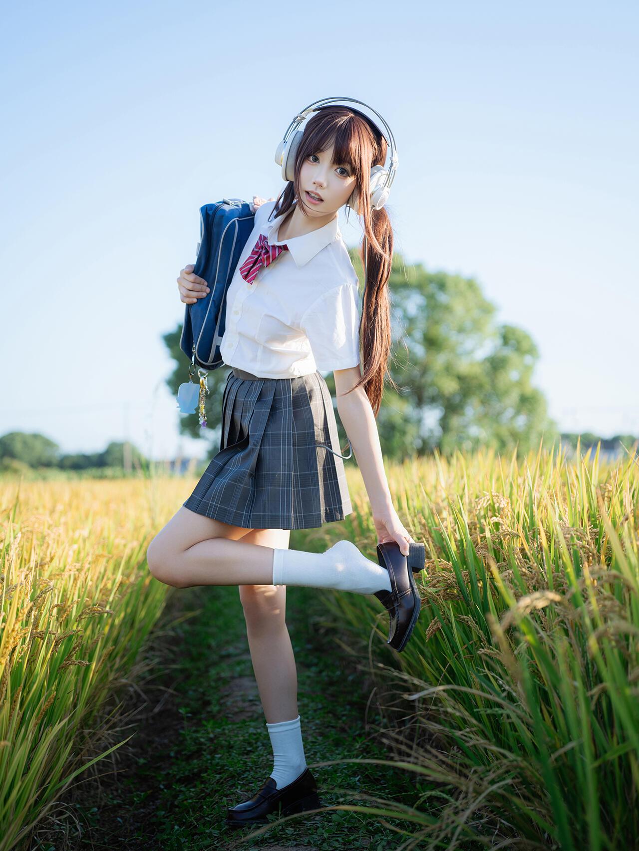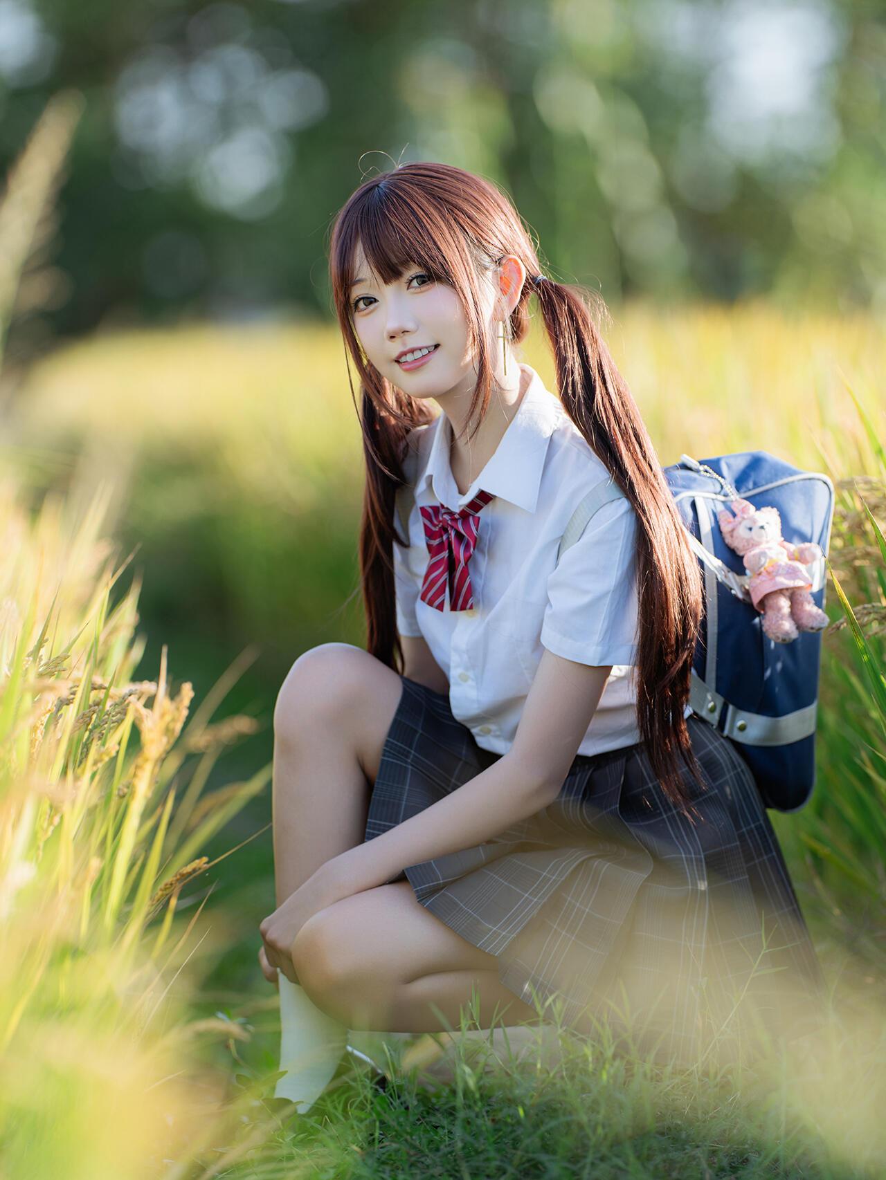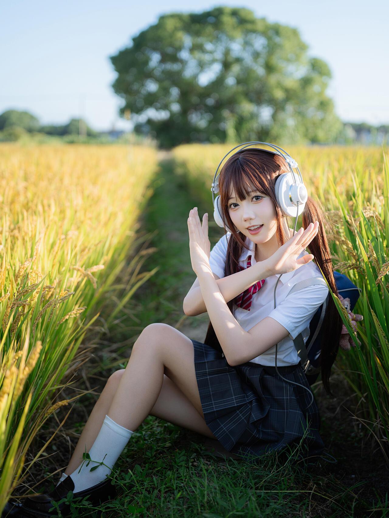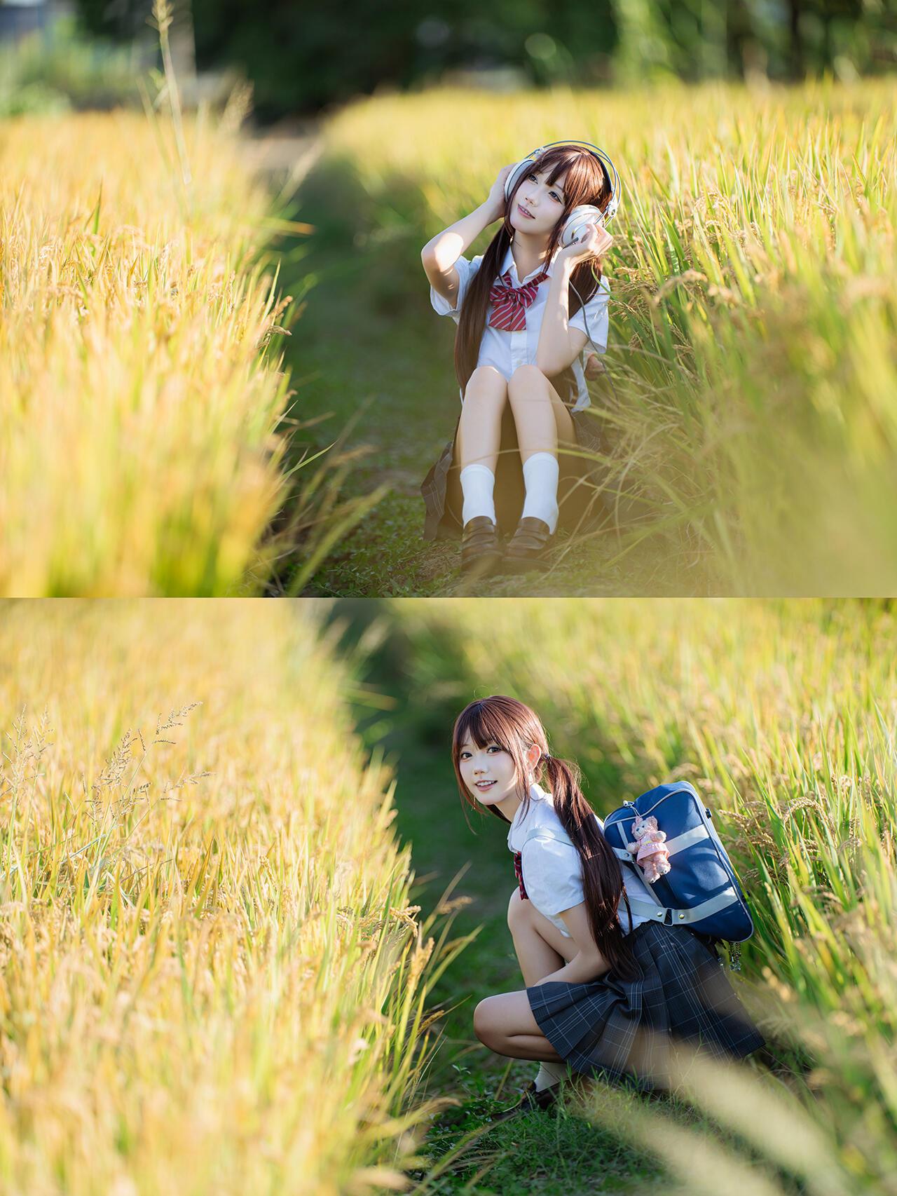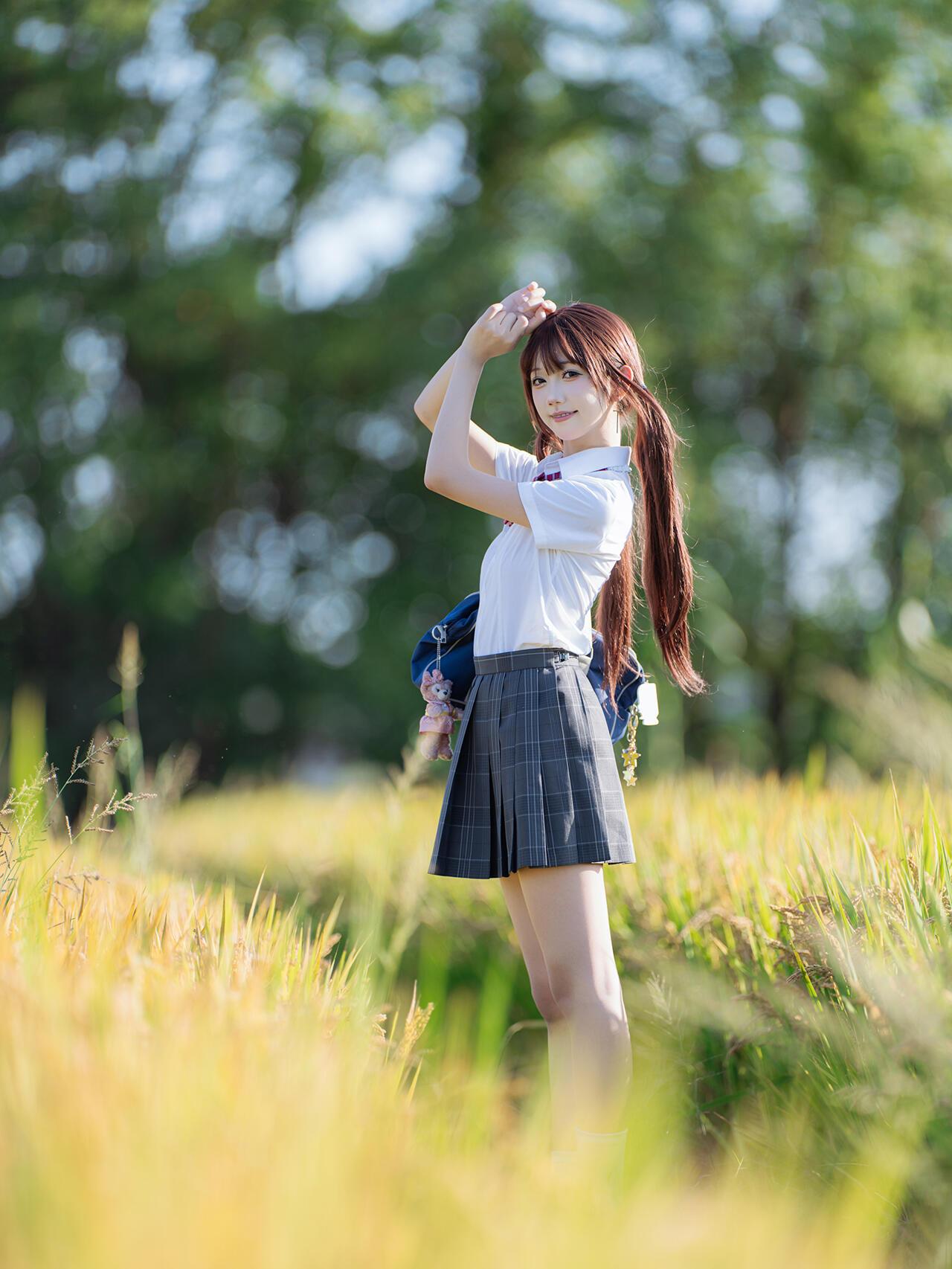这组稻田人像,以“制服少女”为锚点,在金黄稻浪的野性张力中,构建出极具反差感的青春叙事。画面里,白衬衫的纯净、格裙的规整,与稻穗的蓬松、草木的芜杂形成视觉对冲,却又因柔光滤镜的调和,让两种质感奇妙融合。 摄影师对光线的把控堪称精妙。选择在黄昏时分拍摄,利用侧逆光勾勒少女发丝的金边,同时让稻田呈现出暖调的通透感,既避免了正午强光的生硬,又赋予画面“放学归途偶遇田园”的叙事感。人物的姿态设计也暗藏巧思:或蹲踞于稻丛间,以低角度强化环境的包裹感;或单腿轻抬,用动态打破静态场景的沉闷;或抬手整理发梢,借肢体语言传递少女的娇俏。这些姿态并非刻意摆拍,而是在“自然互动”的逻辑下自然生发,让“JK少女误入稻田”的设定更具说服力。 细节处的用心同样加分。背包上的粉色玩偶、耳机的金属光泽、领结的红纹,这些元素在大面积的黄绿主色调里形成视觉锚点,既丰富了画面层次,又强化了“青春符号”的表达。整体而言,这组作品成功在“糖水片”的甜腻与“纪实风”的粗粝间找到平衡,用稻田的质朴托举制服的青春,完成了一次在自然里的造梦实验。