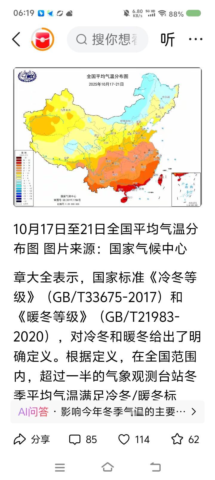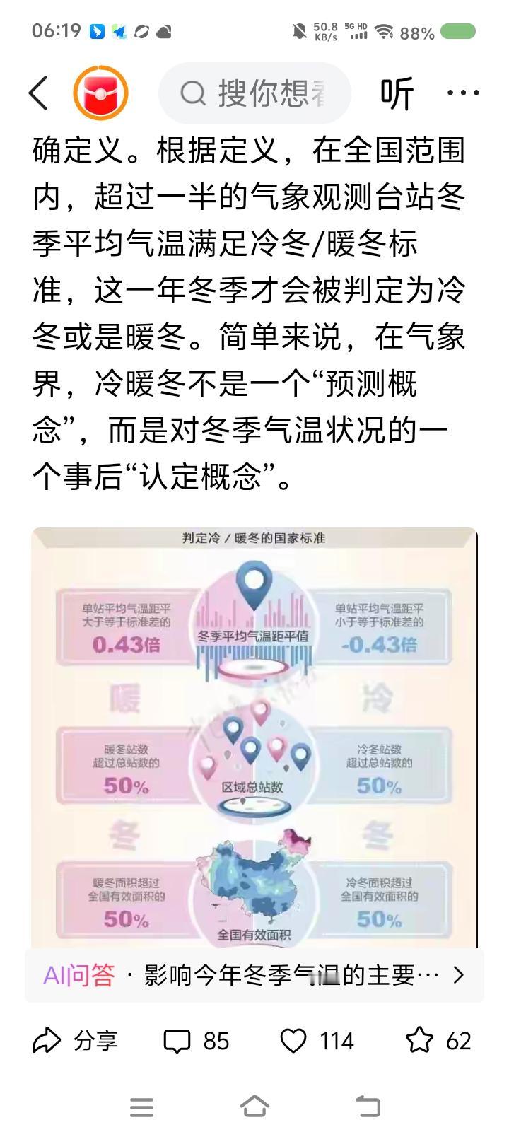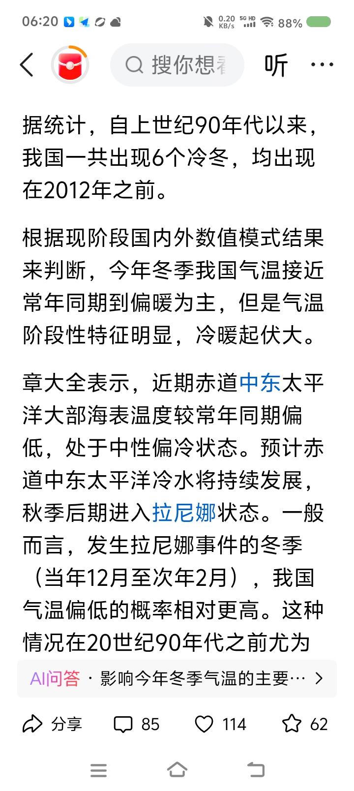 今年冬天会是冷冬吗? 看了这篇文章,结论有了。 我概括一下专家意见: 一、是否是“冷冬”,明年才知道。因为这个概念是认定,不是预测。 二、专家预测,今年我国冬天整体接近常温值,偏暖。 三、赤道一带,中性偏冷。 我尽力了,伙计们。南方的小土豆们,要不囤点土豆和蜂窝煤?尽量不吃反季菜,可否省电省燃气。