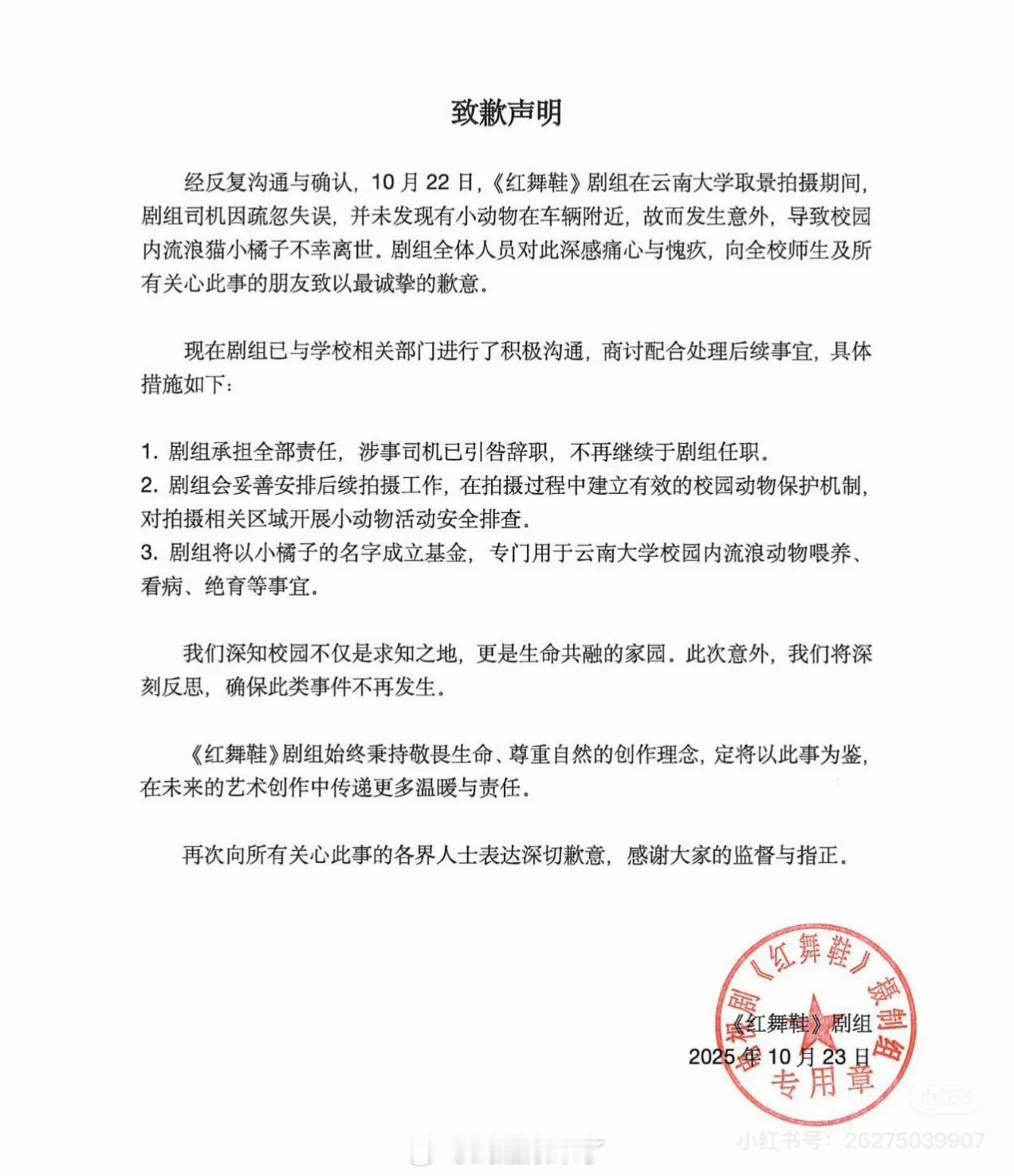 《红舞鞋》剧组在云南大学内驾车超速行驶,导致一只小猫不幸死亡,于凌晨发布道歉声明,表示将以“小橘子”为名成立专项基金。