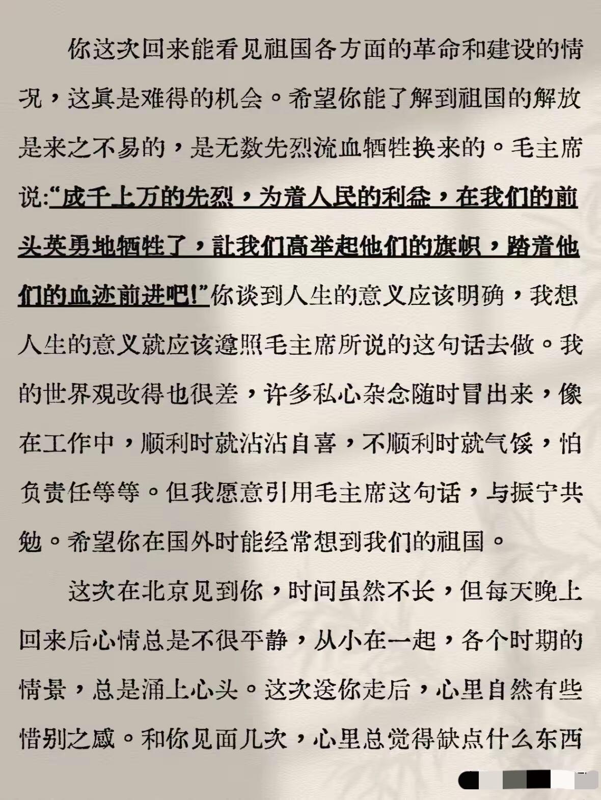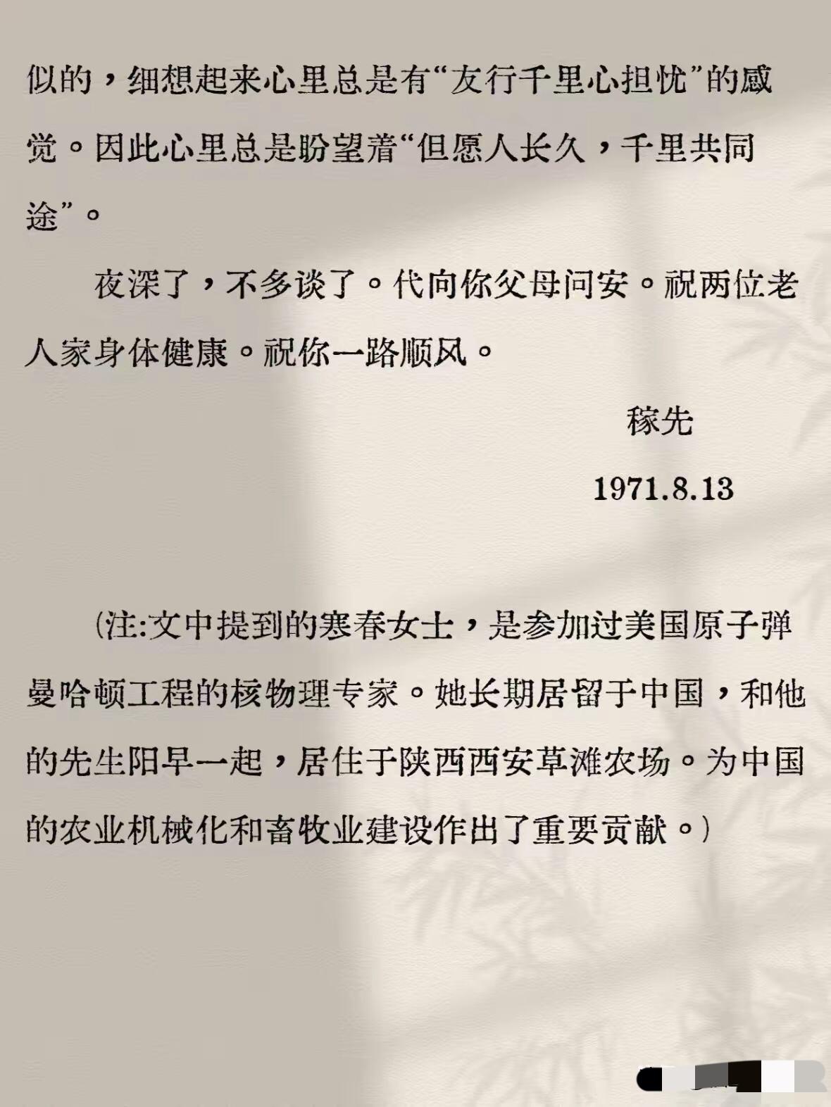 邓稼先写给杨振宁的信太感人肺腑! 披露一段离奇的陈年往事。[加油] 邓稼先和杨振宁是发小。两人的父亲都在清华大学任教。他们也是北京崇德中学的同学,但当时邓稼先上初一,杨振宁上高一。 这是1936年的事。1937年七七事变爆发,北平沦陷。杨振宁先回到合肥,后又随母亲经武汉、香港、越南辗转到昆明,邓稼先则是随父母从北平直接去了昆明。 1938年,杨振宁以总分第二名的成绩考进了西南联大。1945年公派赴美留学,学的专业是理论物理,毕业后进入普林斯顿高等研究院工作。1957年拿到了诺贝尔物理学奖。 1941年,邓稼先也考入了西南联大。1948年自费赴美留学,学的专业是核物理。他仅用不到两年时间便拿到了博士学位,之后仅过了9天,于1950年8月,便毅然决然地踏上了报效祖国的归国之路。 1958年,邓稼先进入核武器研制机构,为中国原子弹研发做出了突出贡献,为此隐姓埋名了28年,由于受到核辐射伤害,于1986年逝世。 1971年,中美关系转好,杨振宁得以回国访问。访问期间同邓稼先见了一面,见面后邓稼先给杨振宁写了一封信。(见下图) 从内容可以看出,他们确实是发小,有着深厚友谊。还能看出邓稼先坚韧无私的爱国情怀以及勇于正视自身问题的纯粹精神。 信的最后,邓稼先向杨振宁说了两句话: 但愿人长久,千里共同途。 表达了希望杨振宁为国效力的期望。 杨振宁