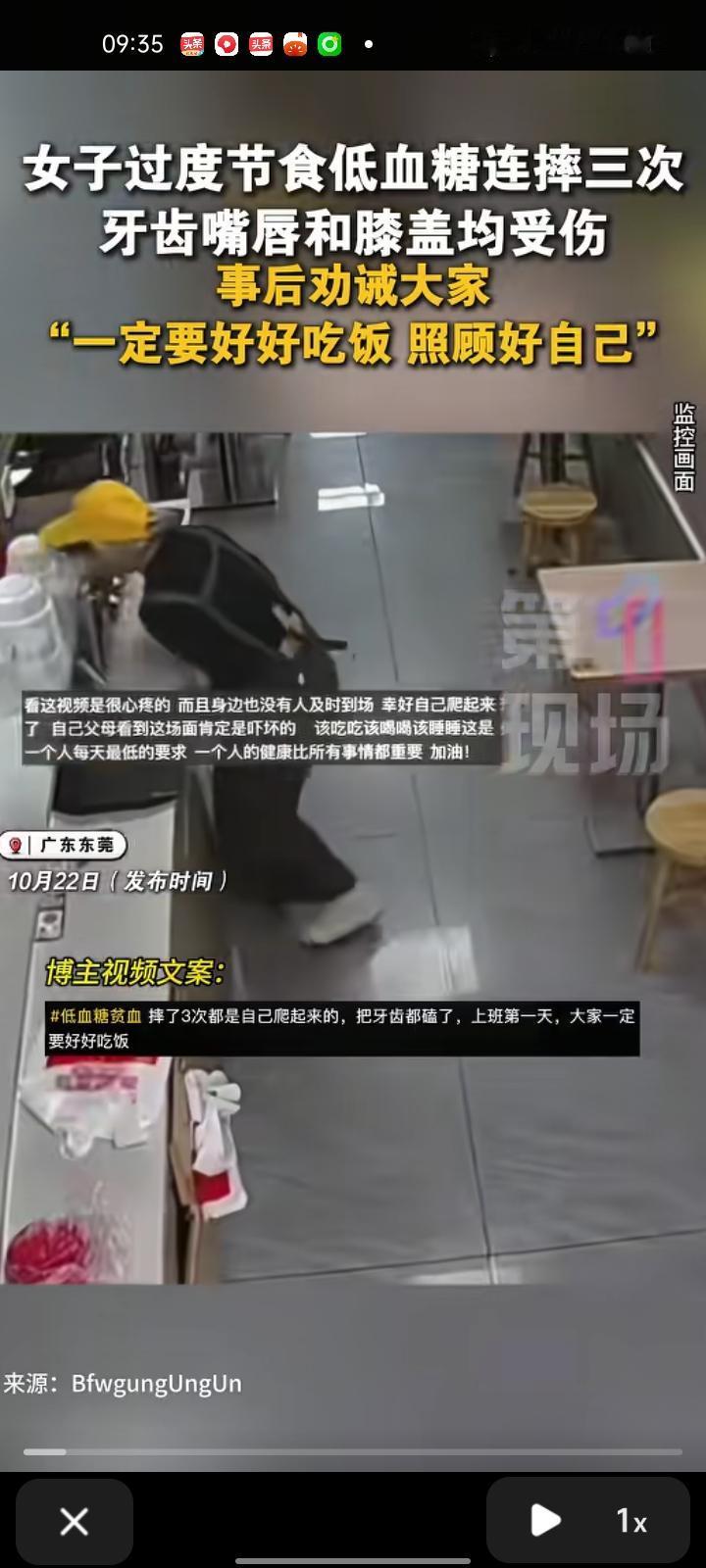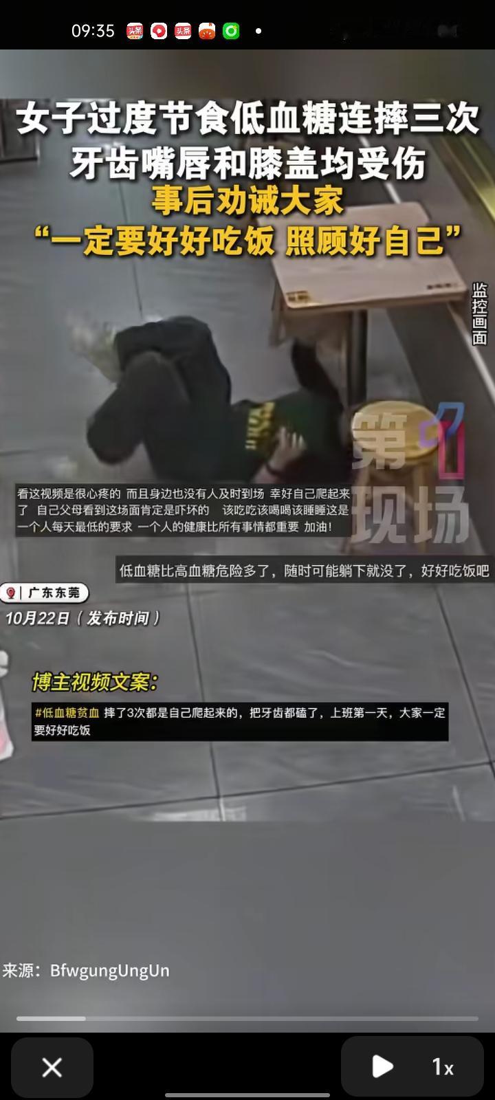10月22日,广东东莞。女子过度节食患低血糖连摔三次,撞伤下巴后倒地,牙齿、嘴唇和膝盖均受伤。 当事人何女士称,摔倒前自己感觉胸闷气短,准备去买有糖的饮,没想到自己在过程中两次摔倒,监控是最后一次。事后劝诫大家,要爱惜自己的身体,好好吃饭照顾好自己。