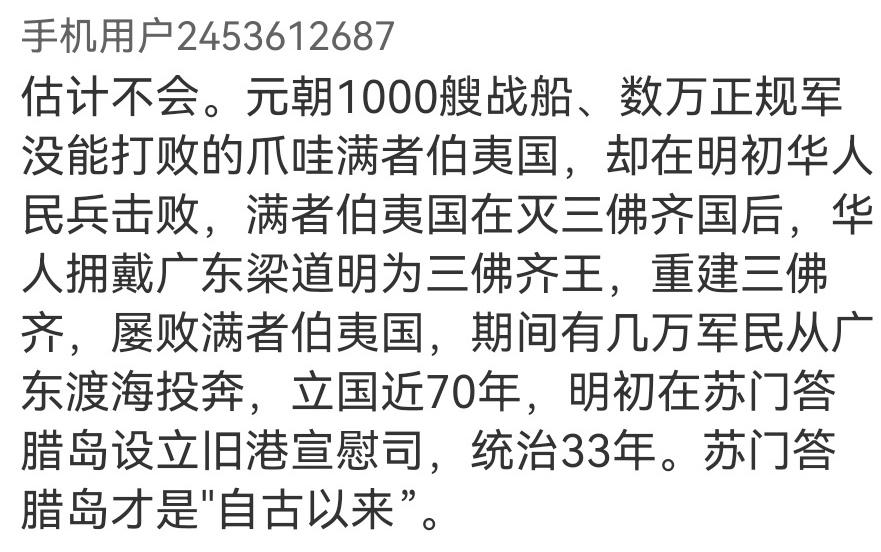中国在大航海时代,真是起了个大早,赶了个晚集。 (图一)印尼,爪哇岛上的元代石刻,“大元国史平章”。 (图二)爪哇岛上曾经的三佛齐王朝,还有一位华人三佛齐王,来自广东的梁道明,立国70年。 (图三)元代还曾征讨过爪哇的满者伯夷国,无果。明初过去的广东人这是不服从朱元璋的势力吧。 中国在大航海时代,真是可惜是起了个大早,赶了个晚集,到现在只能在南海围些岛礁了。