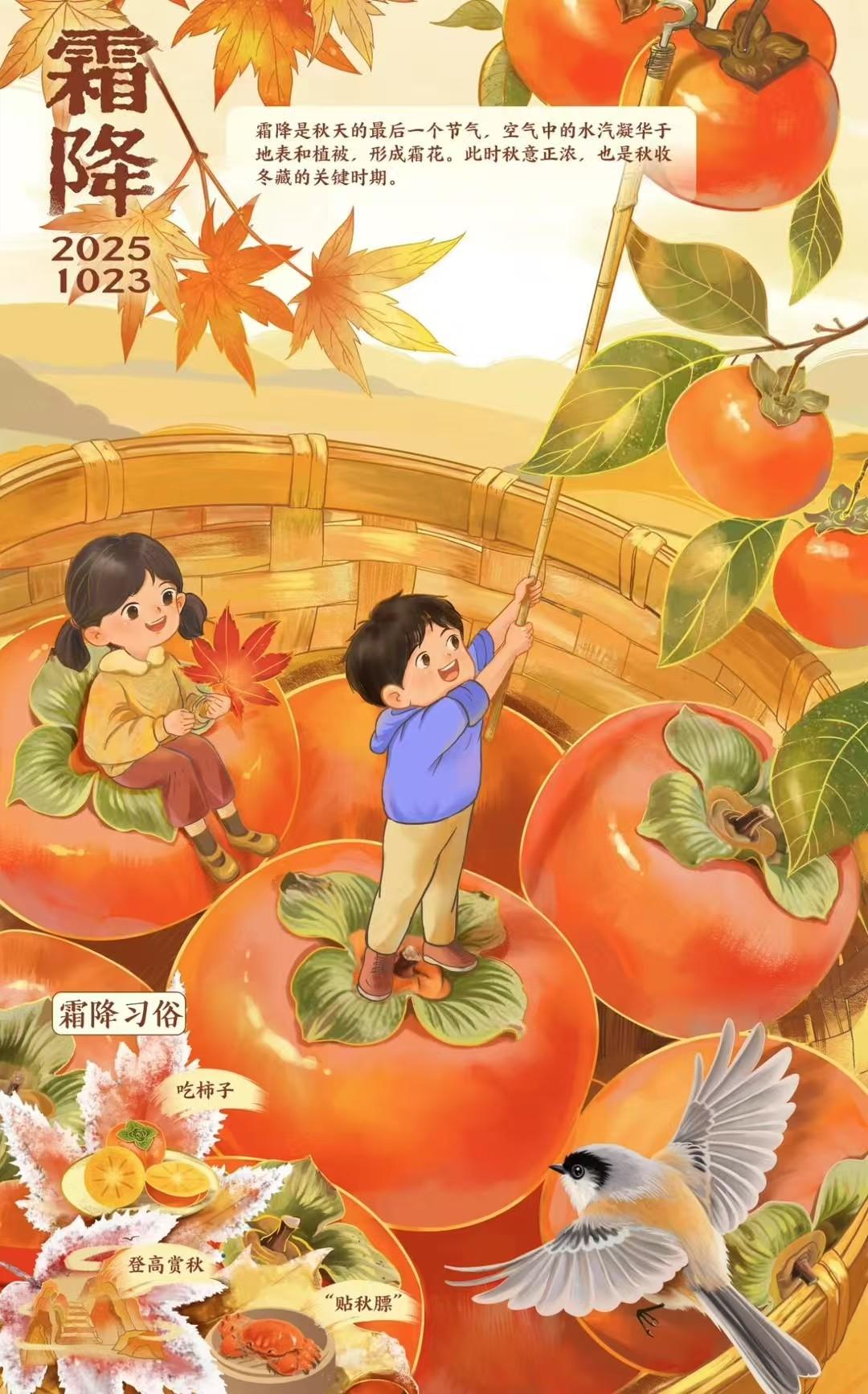 霜降吃柿子的由来,一是此时柿子刚好成熟,果肉清甜软糯、营养丰富,是当季“应景”的美味;二是民间认为霜降吃柿子能“补冬”,有御寒保暖、清热润燥的寓意,还流传着“霜降吃丁柿,不会流鼻涕”的俗语。 今天你吃柿子了吗?