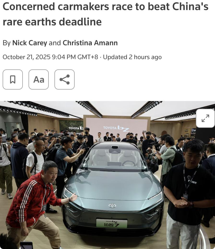 外媒:全球汽车制造商正在紧急寻找稀土资源,以应对中国即将实施的出口限制。 中国控制着全球70%的稀土开采、85%的精炼产能以及约90%的稀土金属合金和磁体生产。稀土被广泛用于汽车零部件,如侧视镜、扬声器、油泵等,电动汽车中更是不可或缺。 尽管有美澳达成的稀土协议,但全球稀土供应仍面临短缺。一些汽车制造商正在开发无稀土电机,但大规模生产仍需数年。中国通过低价策略削弱了海外新稀土矿的开发,使得替代来源微不足道。