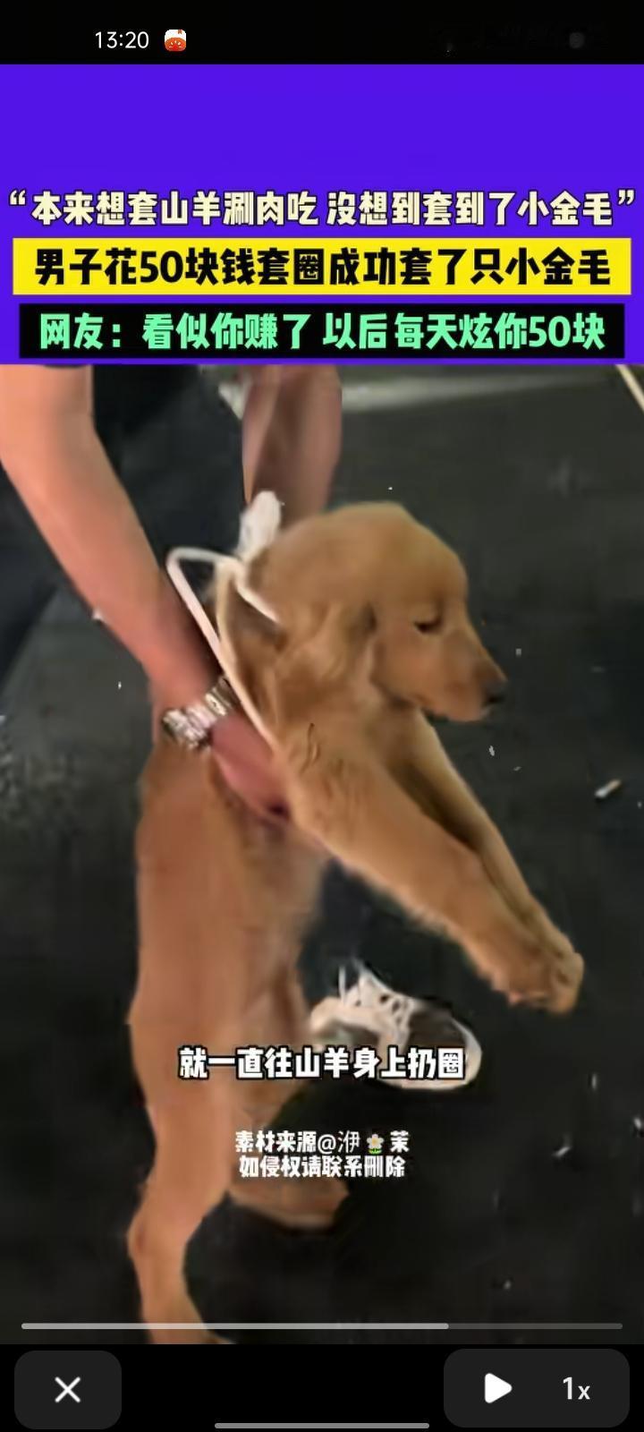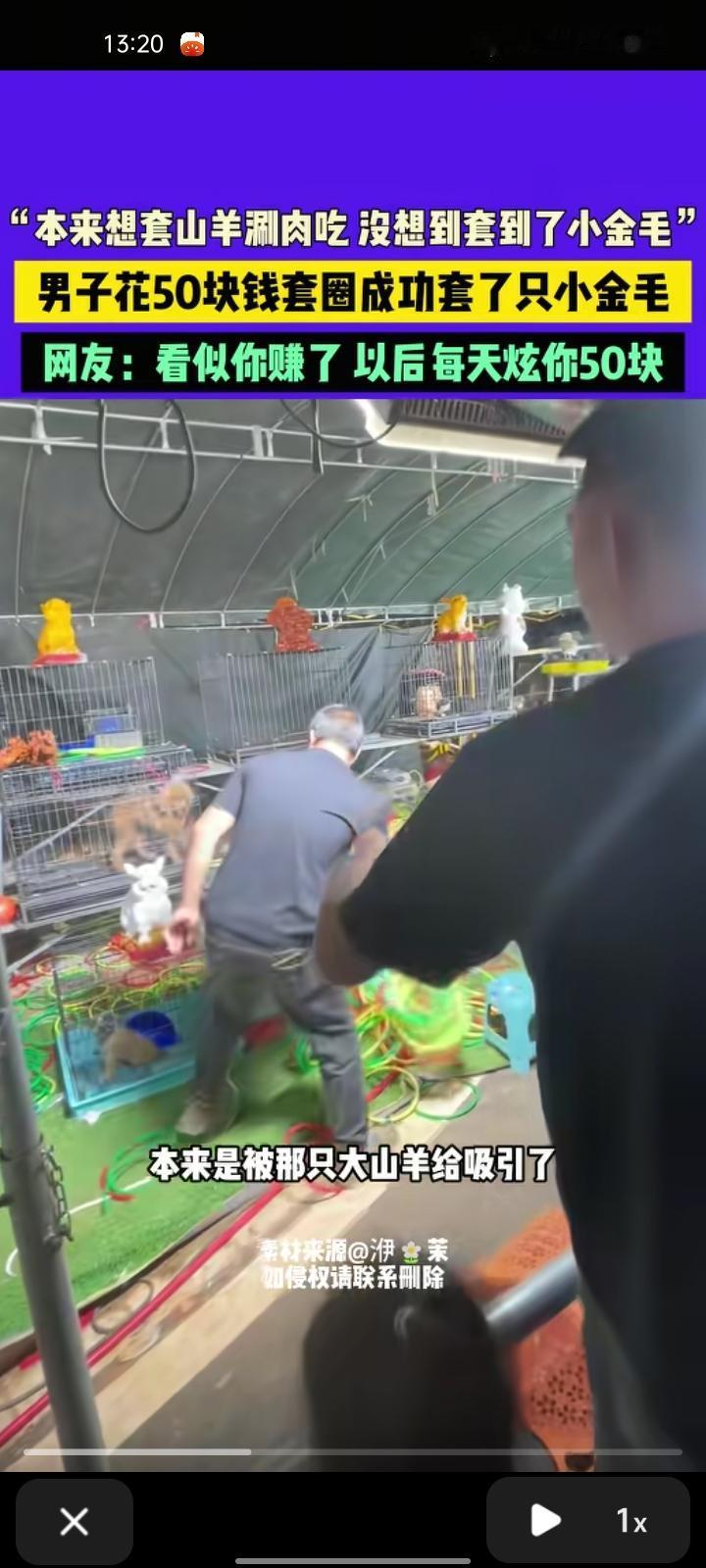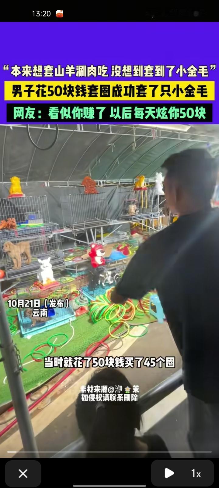 10月21日,云南保山。男子花了50元买45个圈,本来是想套山羊的,老爷爷的生日快到时涮羊肉吃,结果圈弹下来套到小金毛身上,金毛后续情况会持续更新。