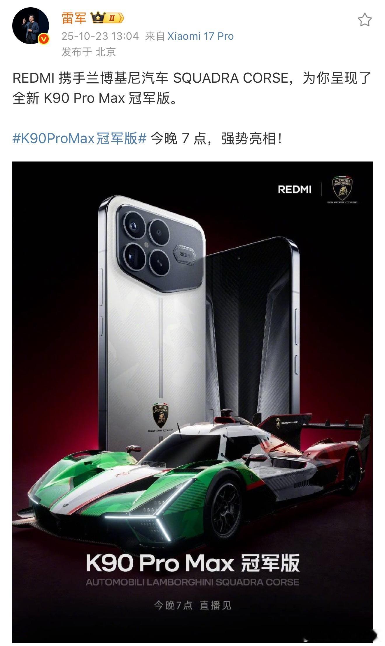 K90ProMax冠军版 Redmi这波还把兰博基尼赛车部门拉过来了!新出的K90 Pro Max冠军版这颜值也太顶了吧。