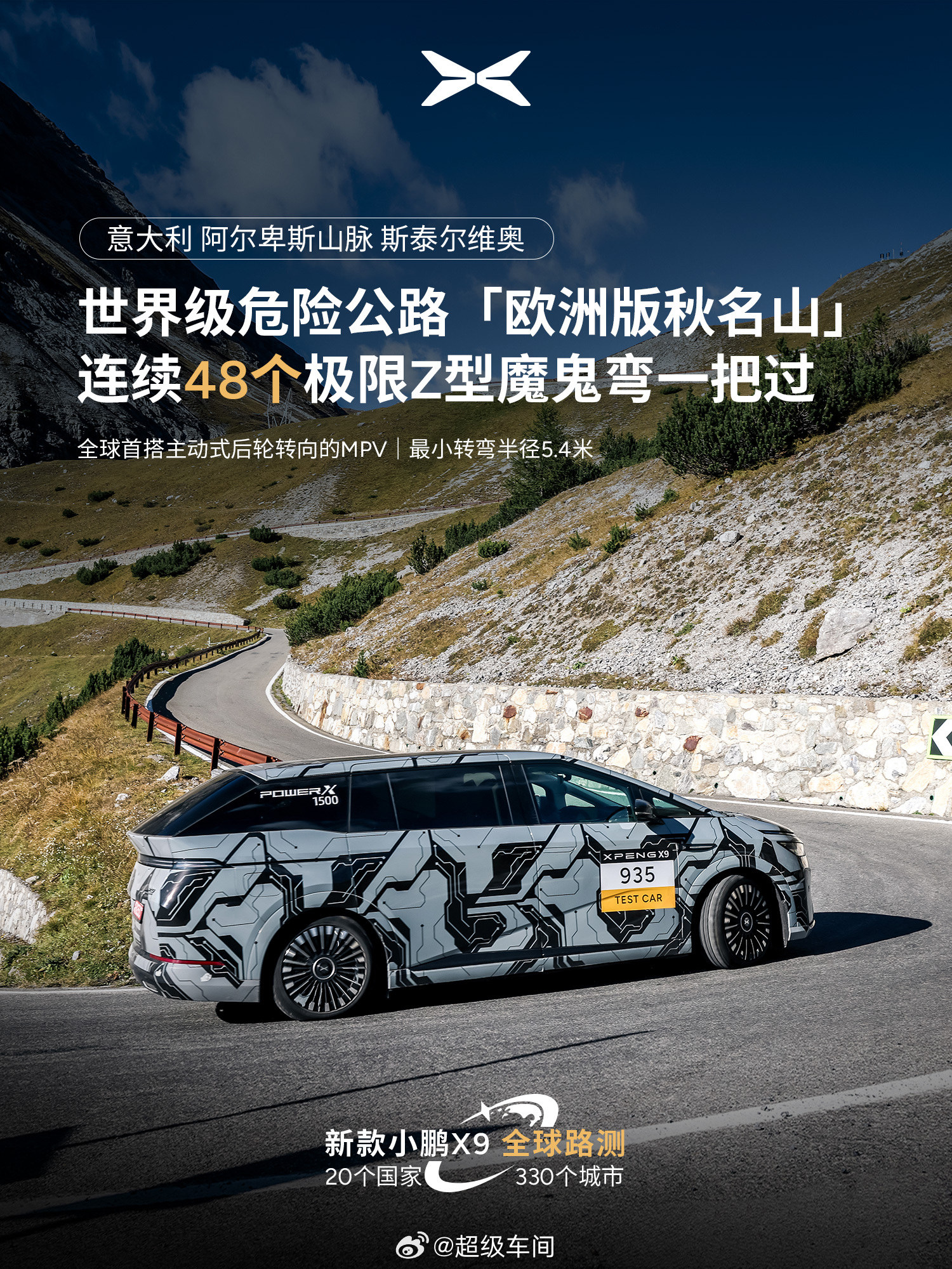 新款小鹏X9再次挑战意大利阿尔卑斯山脉斯泰尔维奥连续极限盘山弯道,通过连续48个极限Z型魔鬼弯,高海拔连续爬坡表现稳定。小鹏X9成功挑战意大利48道魔鬼弯新能源汽车小鹏汽车 ​​​
