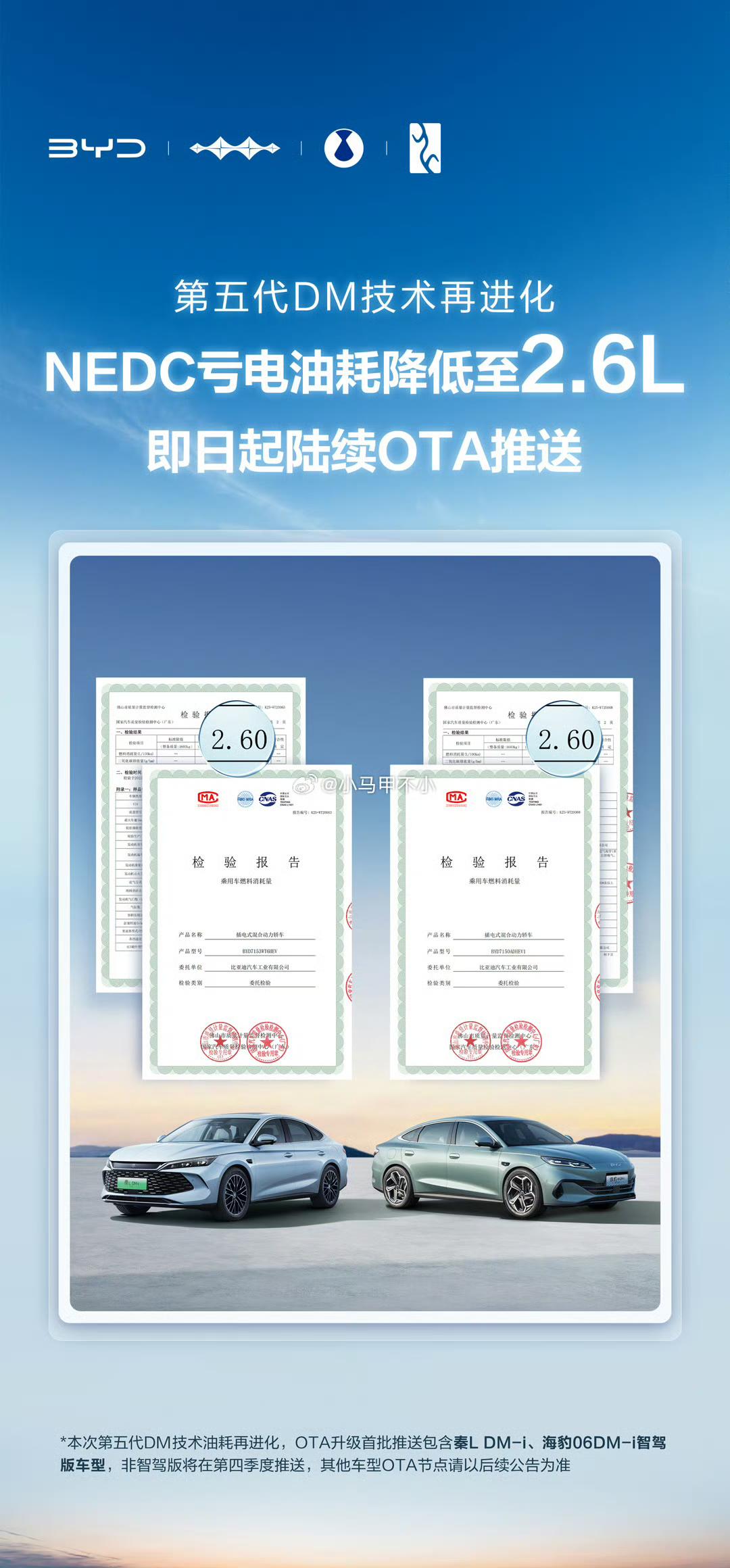 今晚秦plus 和秦L EV同步上市 7.98万起步价格也是让不少年轻用户更容易触手可及 但发现这次比亚迪还带来了不一样的OTA 别家的OTA负责升级系统 这次比亚迪的OTA居然是帮你降低油耗 搭载着第五代DMi技术的车型都将陆续获得推送 NEDC亏电油耗仅2.6L/百公里 而且不只是新车才享有这项福利 老车主也能同时享受 别家还在拼发动机热效率的时候 比亚迪直接来一招AI大模型+大数据分析 匹配到每位车主的不同驾驶习惯以及风格 让你的油耗控制更低 这次不仅价格上吸引 连技术角逐部分都开始优胜劣汰了【来自懂车帝车友圈】