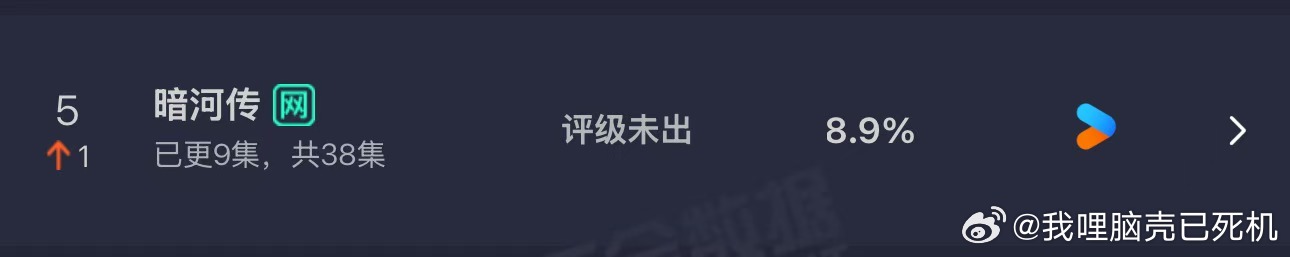 暗河传8.9%,们暗河传真的是在稳步上升中啊,这个苏暮雨的故事带感又爽,谁能不期待这个苏暮雨接下来的剧情见面呢~ ​​​
