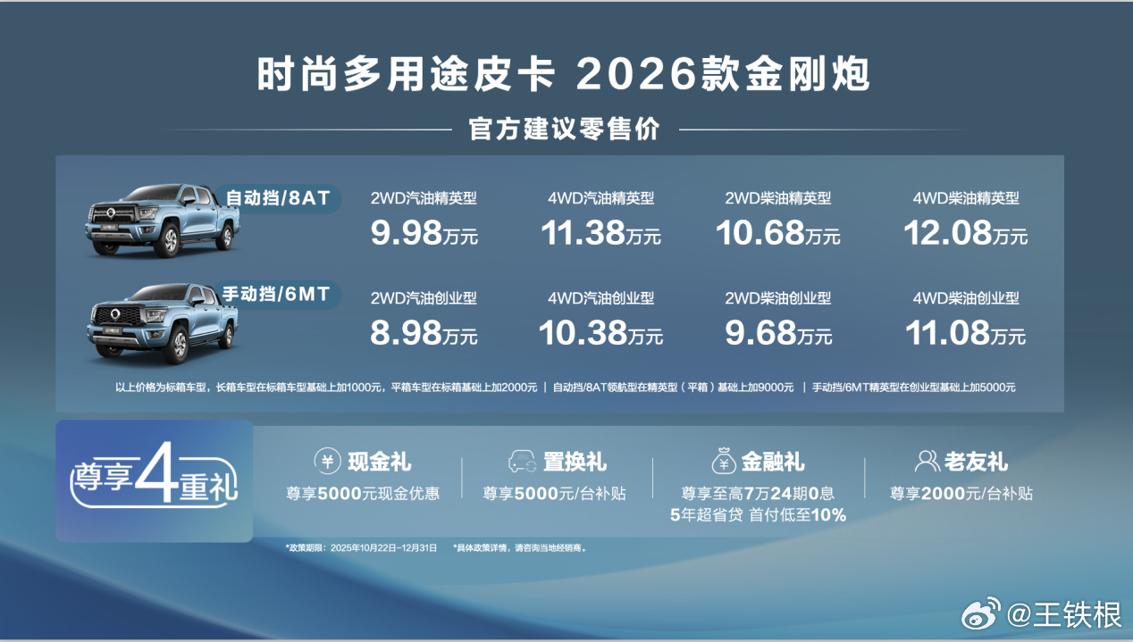 就拿金刚炮这款精品皮卡来说,四驱采埃孚8AT的版本也只要11万。开15年,等于这个车本身一天只有20块钱。
